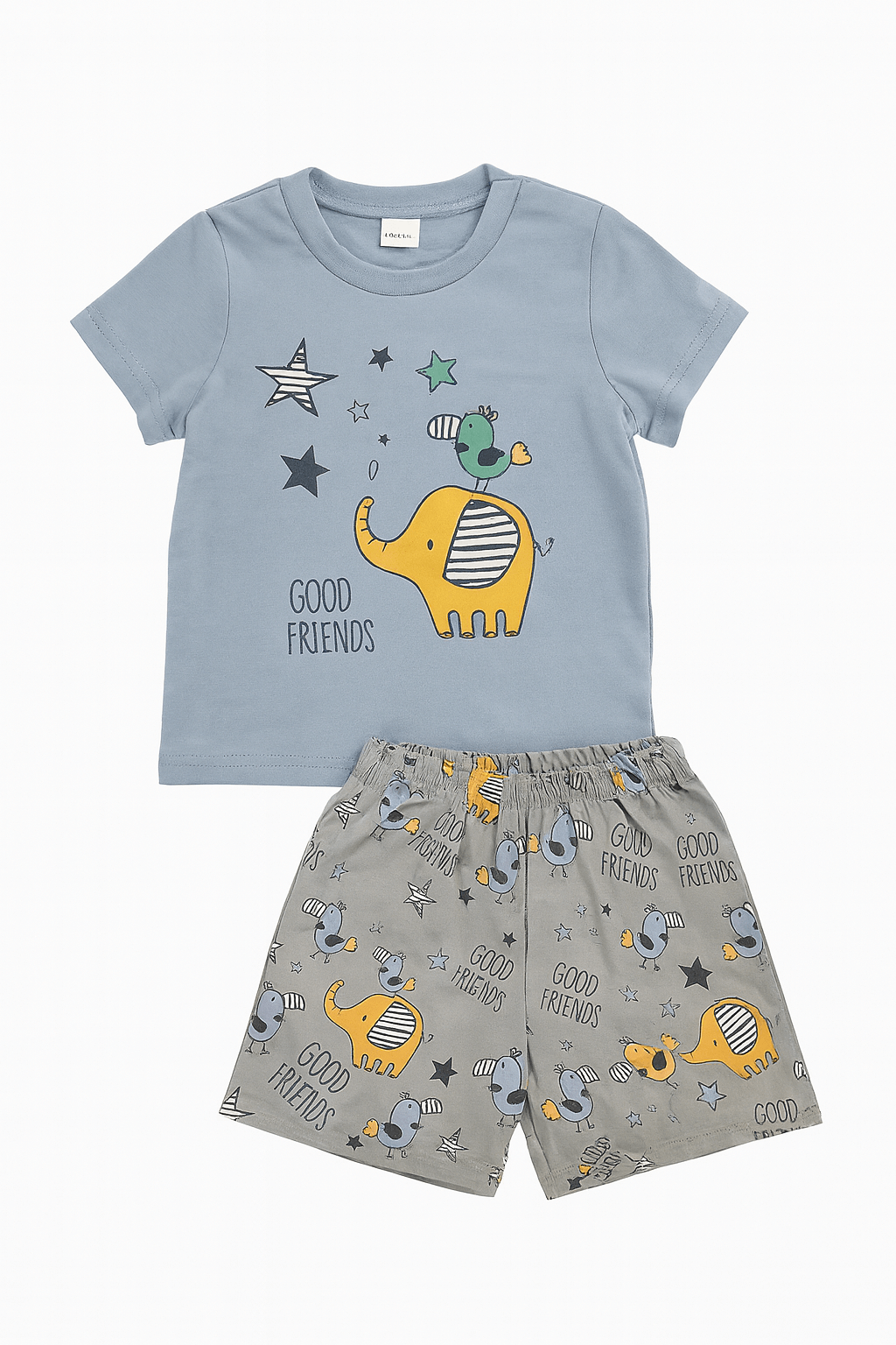 طقم اطفال يتكون من تيشيرت أزرق بسيط مزين برسمة فيل أصفر وعصفور صغير مع بعض النجوم، إلى جانب شورت رمادي مزخرف بنفس الرسومات بشكل متكرر ليعطي مظهر متناسق. يتميز الطقم بتفاصيل لطيفة وملونة، وخامته القطنية تمنح إحساس بالراحة في الاستخدام اليومي للأطفال