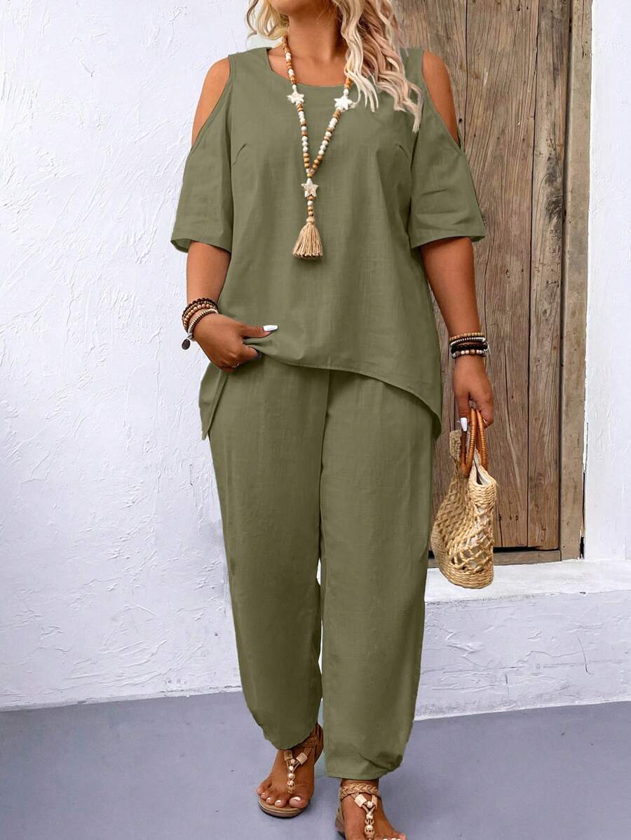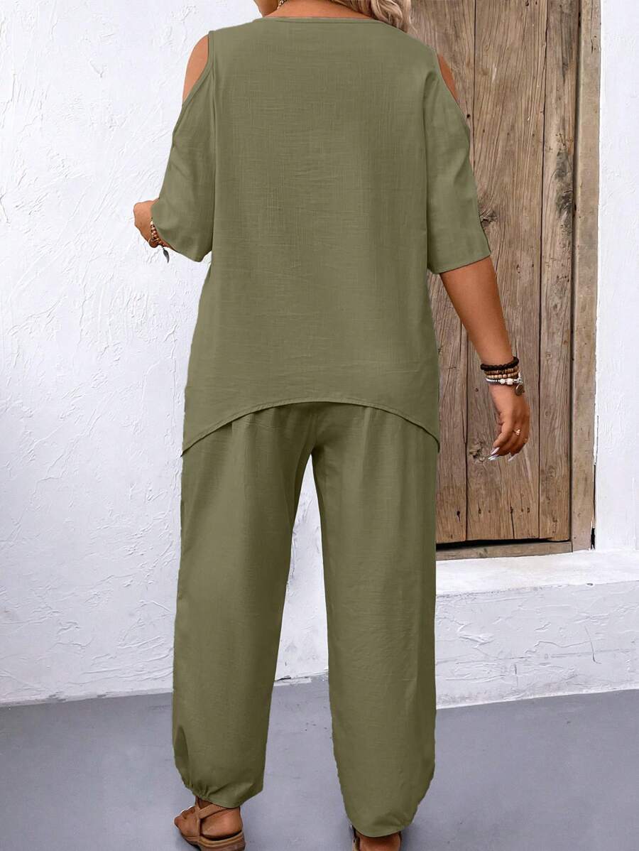 طقم بلوزة صيفية سادة بأكمام مكشوفة وبنطلون كاجوال فضفاض للنساء م بمقاسات كبيرة، قطعتين