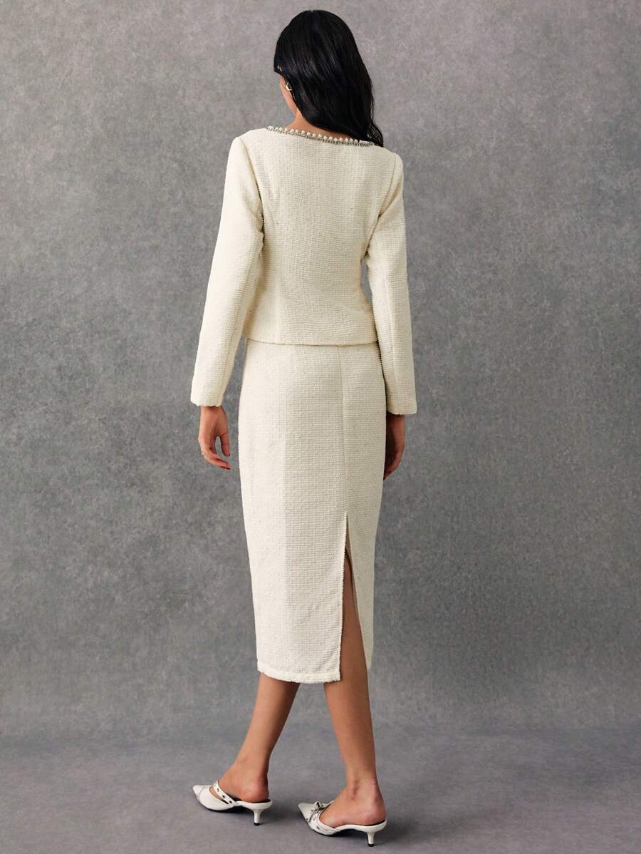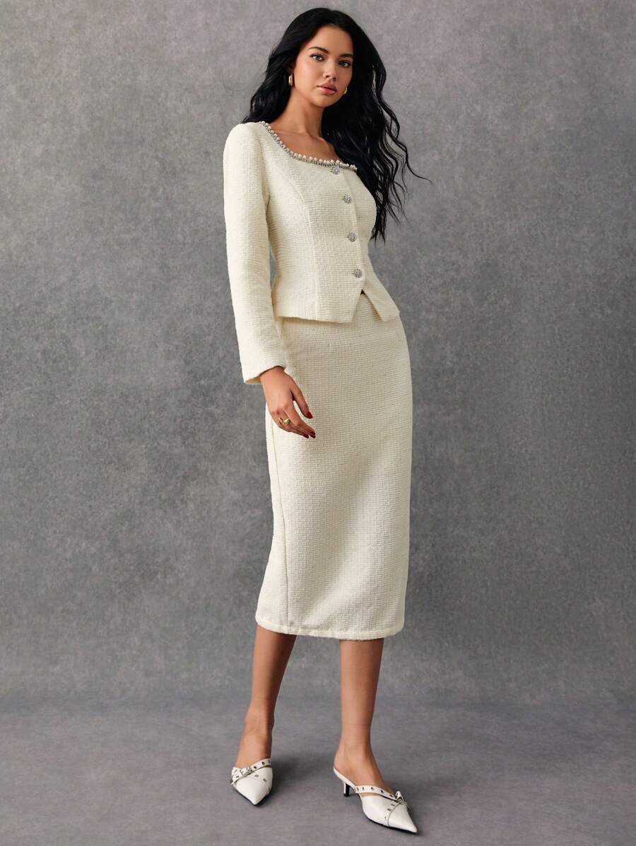 طقم بلوزة وتنورة أنيقة مرصعة بأحجار الراين من Poéselle ، طقم خريفي نسائي أنيق من قطعتين، طقم قميص وتنورة بأزرار من الجاكار