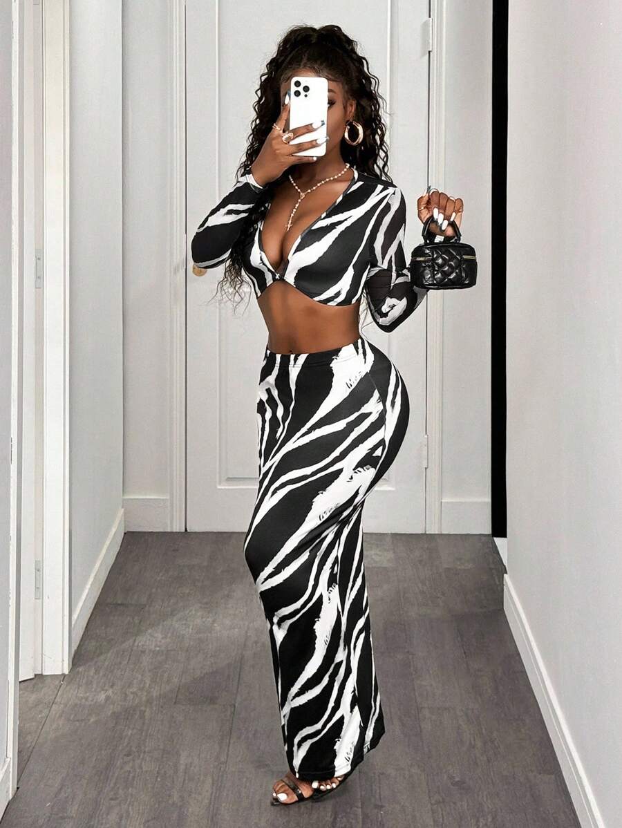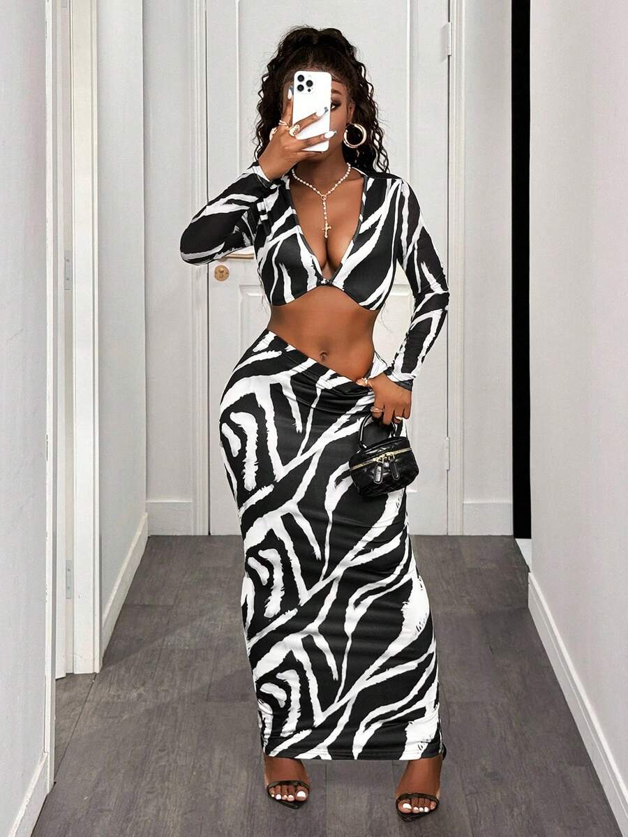 طقم تنورة وقميص قصير من BamGleam نسائي بنقشة زهور عميقة على شكل حرف V من القماش الخريفي للنساء