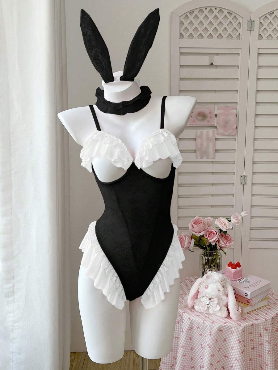 طقم لانجري نسائي 3 قطع – جمبسوت أرنب مثير بدانتيل وشرائط رفيعة من PetitDoll