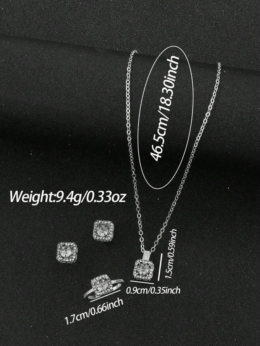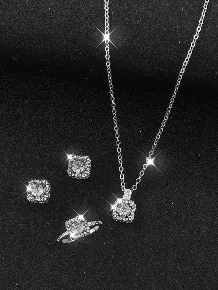 طقم مكون من 4 قطع من الأقراط المرصعة بالزركونيا اللامعة وحجر الراين المكعبة وقلادة وخاتم بتصميم أنيق وفاخر