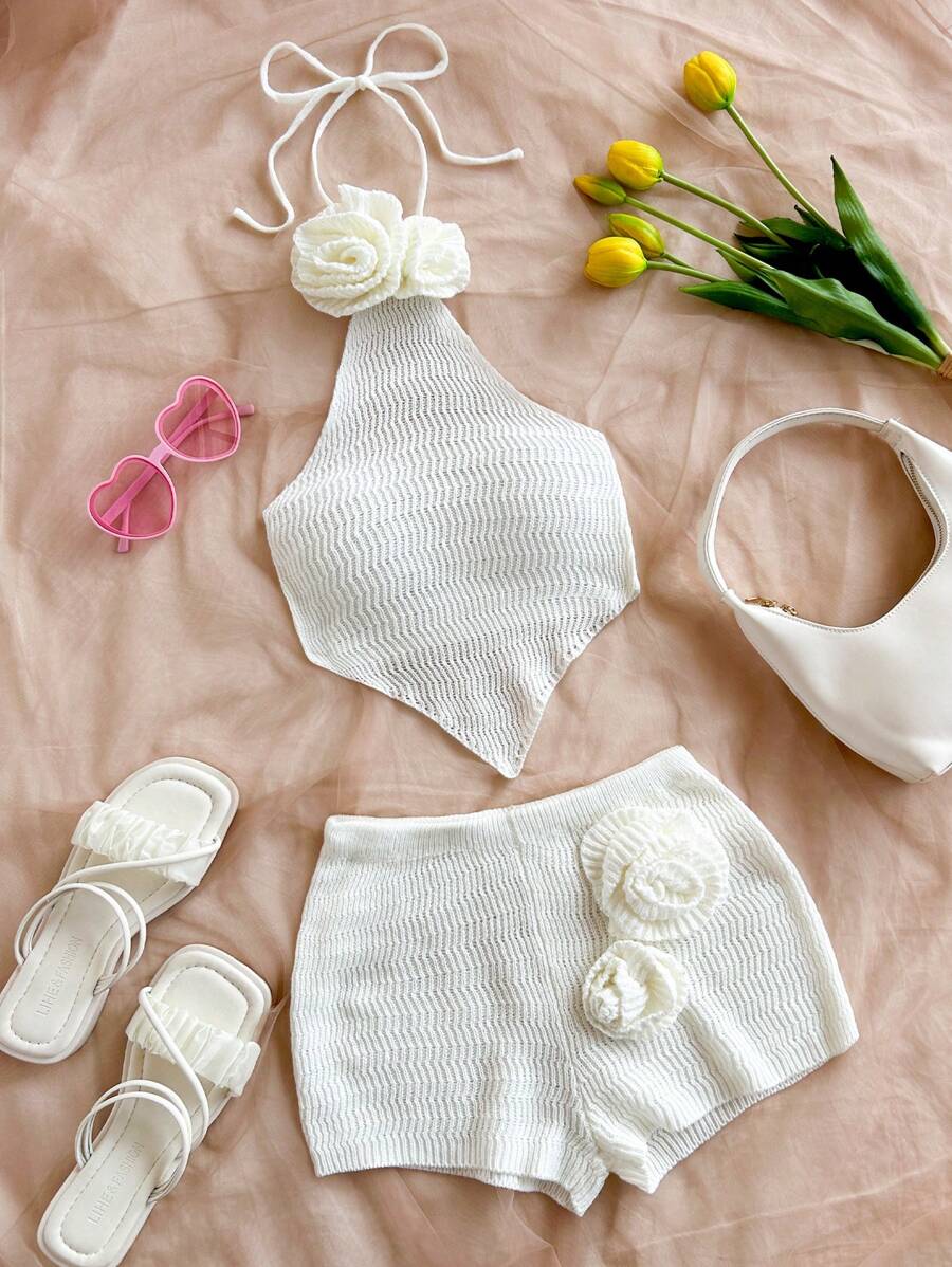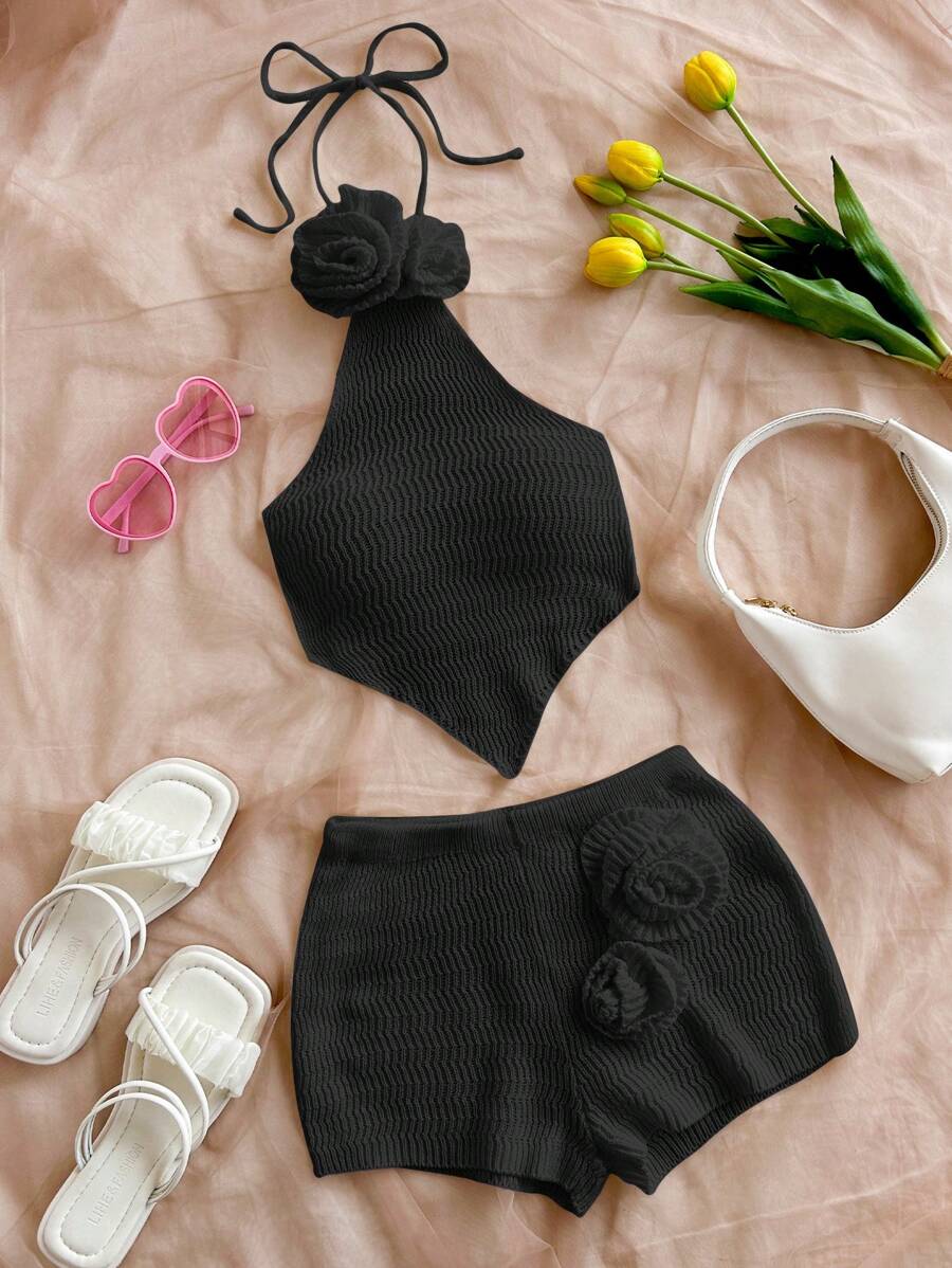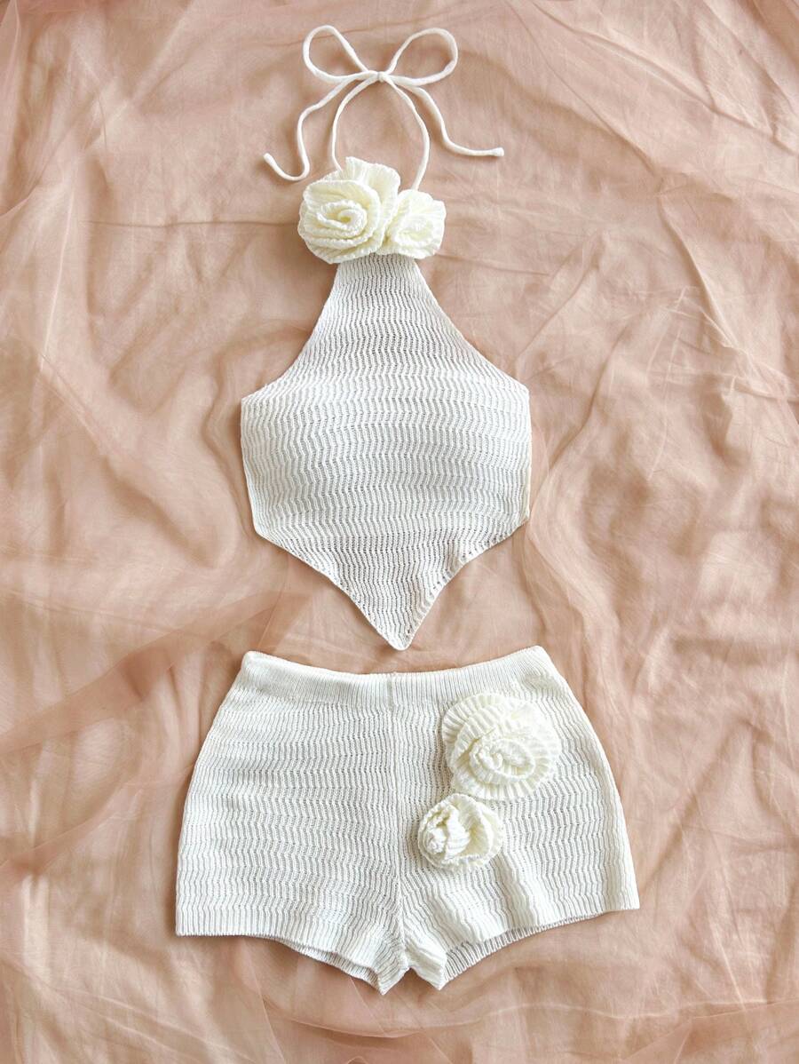 طقم من قطعتين من Soleia مصنوع يدويًا من أعلى وأسفل بدون ظهر مزين بالزهور ثلاثية الأبعاد وشورت قصير جدًا