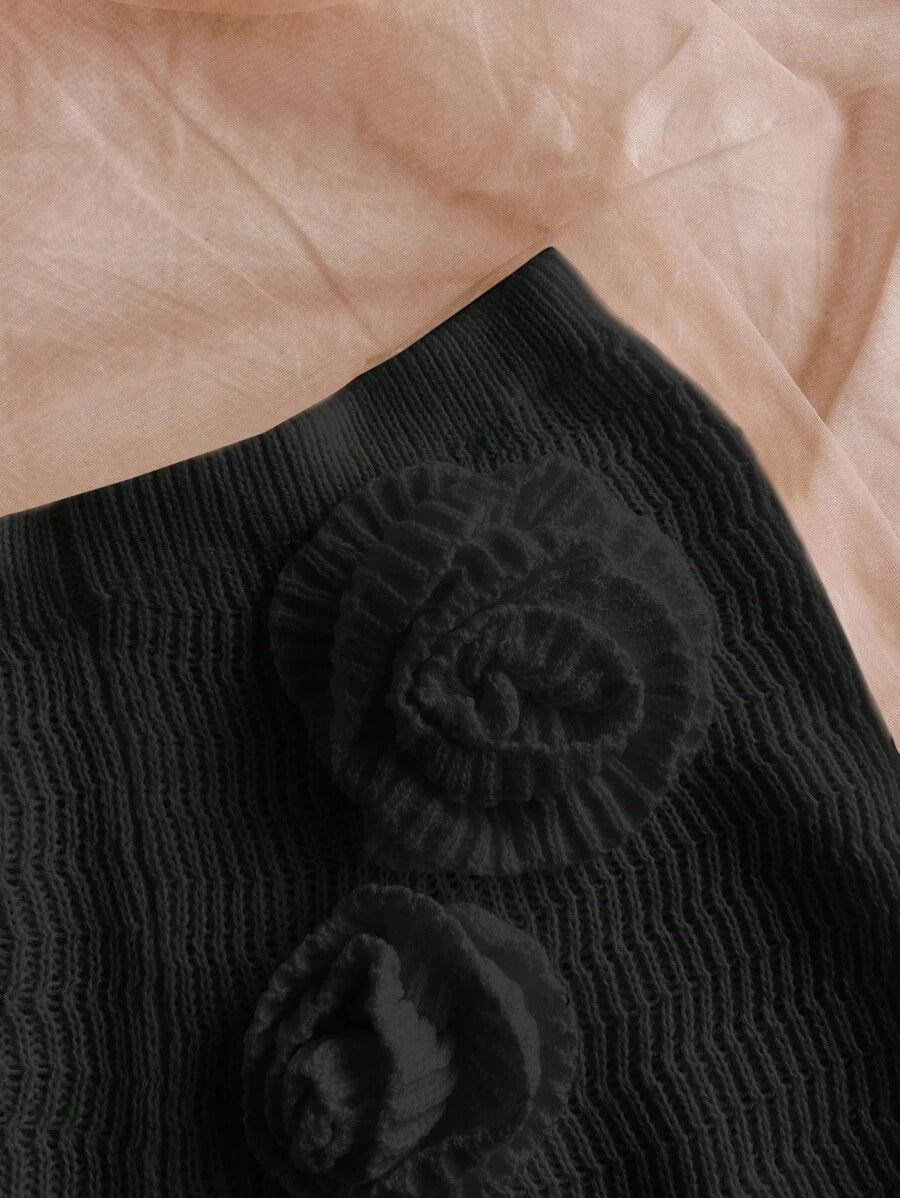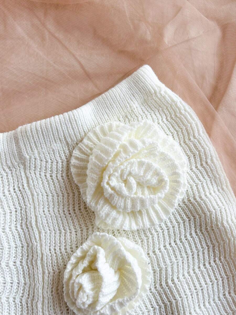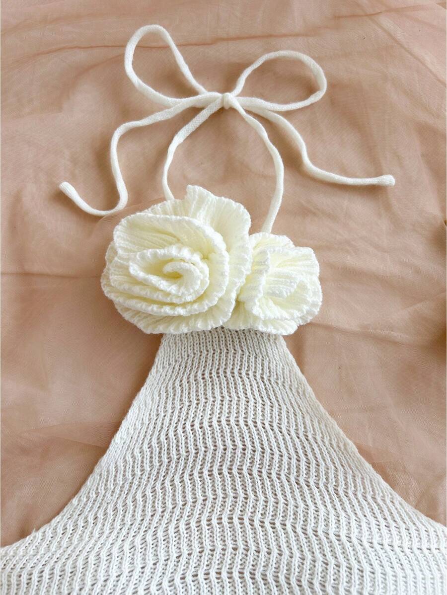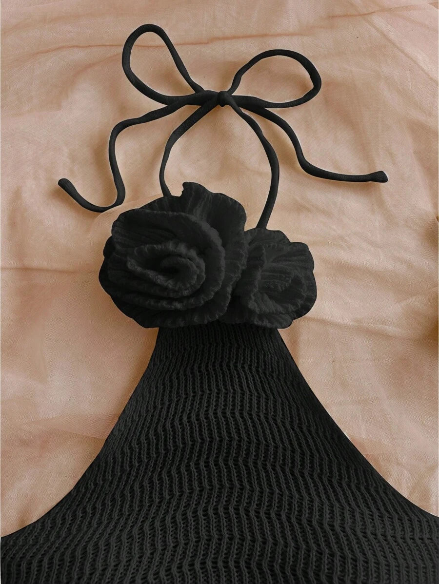 طقم من قطعتين من Soleia مصنوع يدويًا من أعلى وأسفل بدون ظهر مزين بالزهور ثلاثية الأبعاد وشورت قصير جدًا