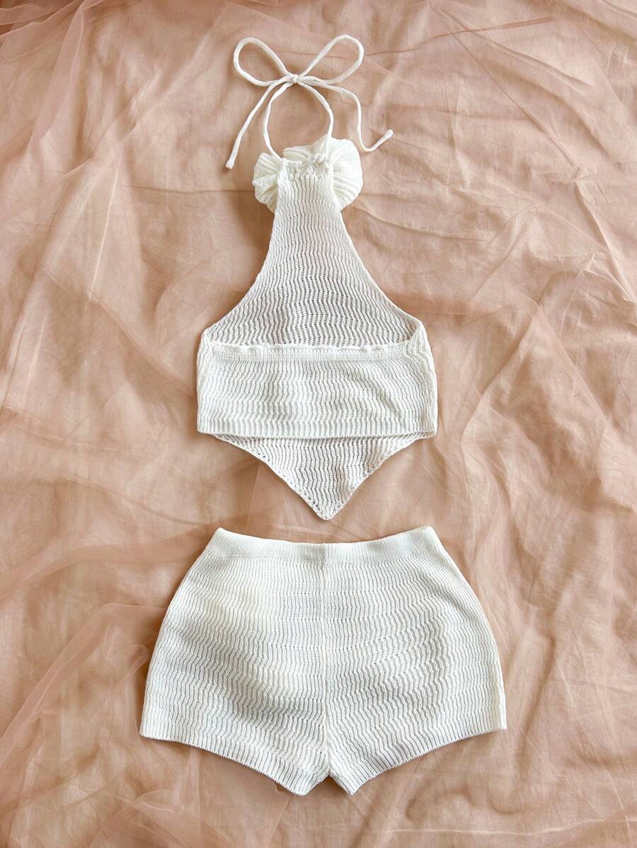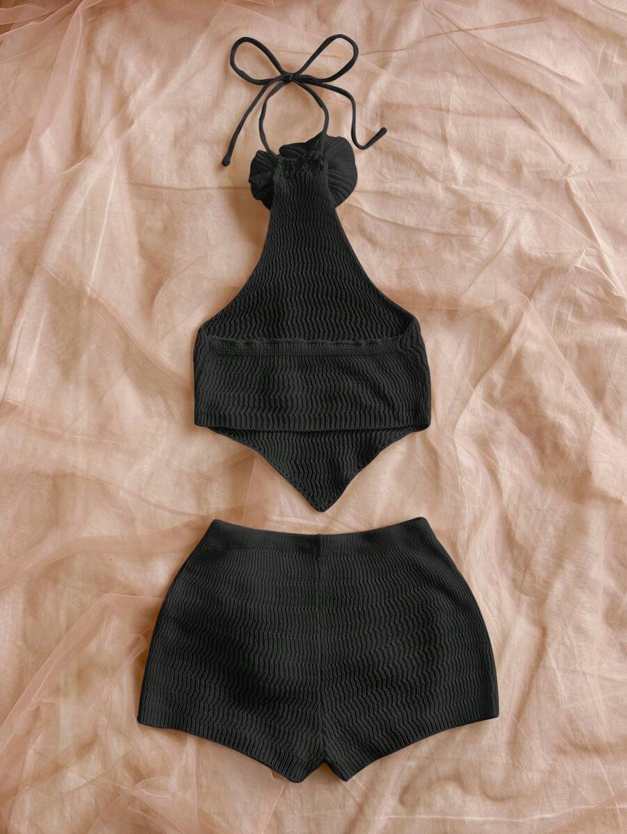 طقم نسائي مصنوع يدويًا يتكون من توب بدون ظهر يُربط من الرقبة وشورت قصير بنفس الخامة، مزين بتفاصيل زهور ثلاثية الأبعاد بلون أبيض. التصميم يعتمد على خامة مرنة بنقشة مموجة خفيفة، ويتميز بمظهر بسيط يجمع بين الطابع الصيفي واللمسات الأنثوية الهادئة.