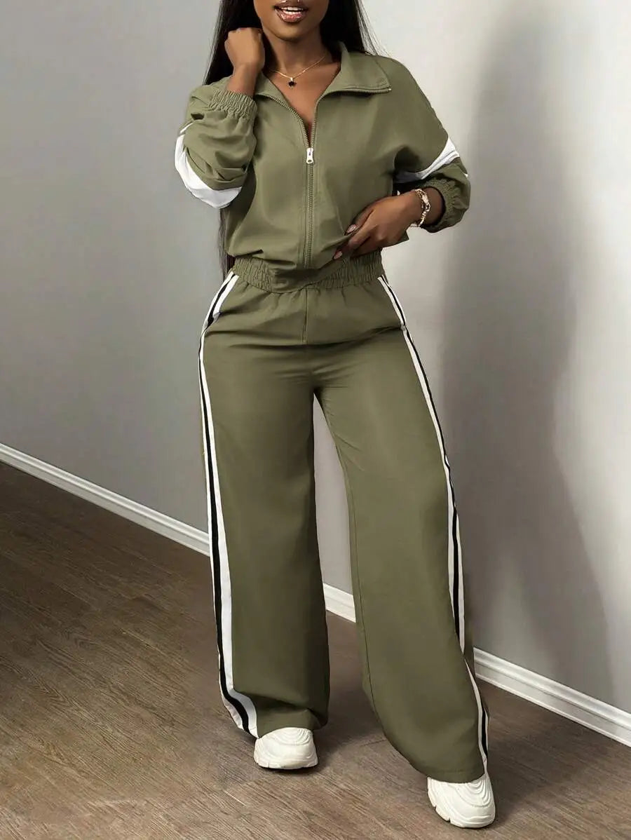 طقم نسائي جديد من Slaydiva، مكون من قطعتين، كاجوال ورياضي، وياقة واقفة، وسحاب، وأكمام طويلة، وكتف مكشوف، وبنطلون واسع الساق