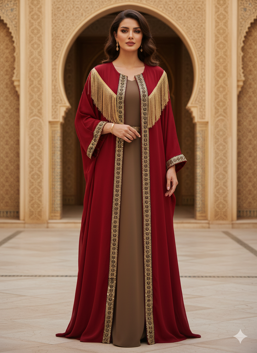 عباية تجمع بين الأصالة والفخامة ، بلون نبيتي غني وتطريز ذهبي يضيف لمسة راقية للتفاصيل. التصميم الكلاسيكي المفتوح من الأمام مع الشراشيب الرفيعة بيخلي الإطلالة متكاملة ومتناسقة، والخامة الانسيابية بتدي إحساس مريح وأناقة بسيطة تناسب المناسبات الهادية.