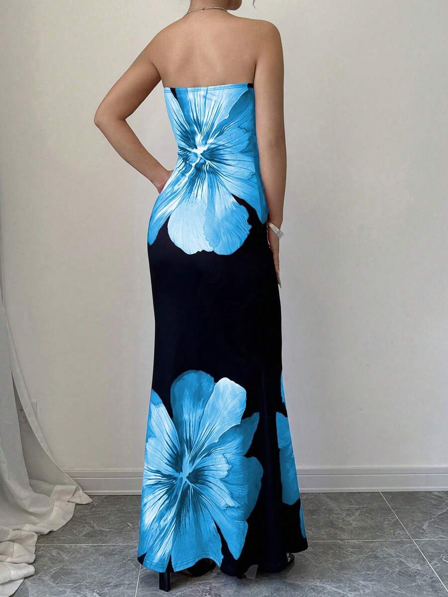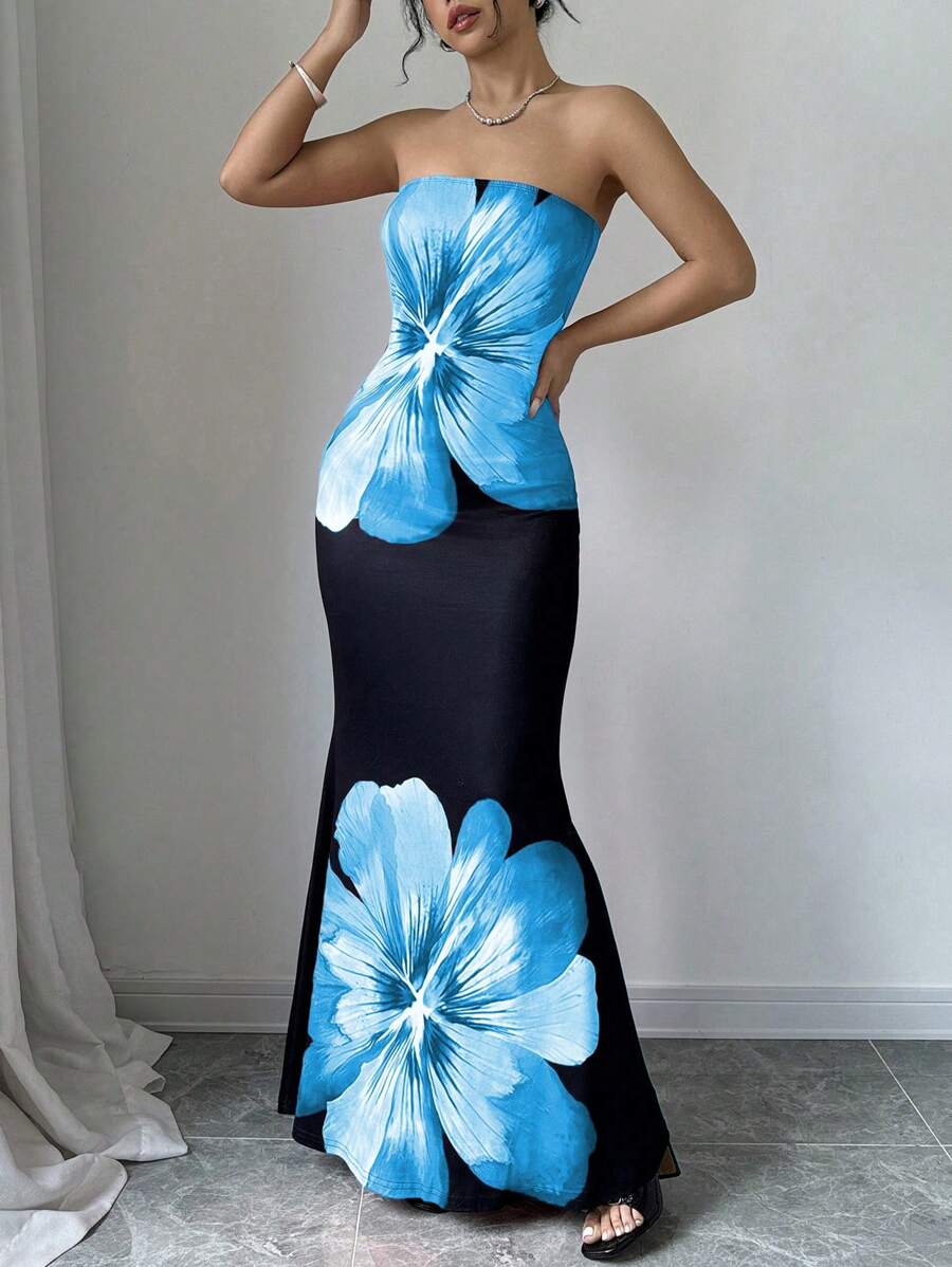 فستان طويل ضيق بدون أكمام بتصميم أنبوبي بسيط، مزين بطبعة زهور كبيرة باللون الأزرق الفاتح على خلفية سوداء. القماش مرن وناعم، بياقة مستقيمة من الأعلى وطول يصل للأرض تقريبًا. تصميم الفستان بيظهر بشكل متناسق وانسيابي، مناسب للإطلالات المسائية أو الصيفية الهادئة.