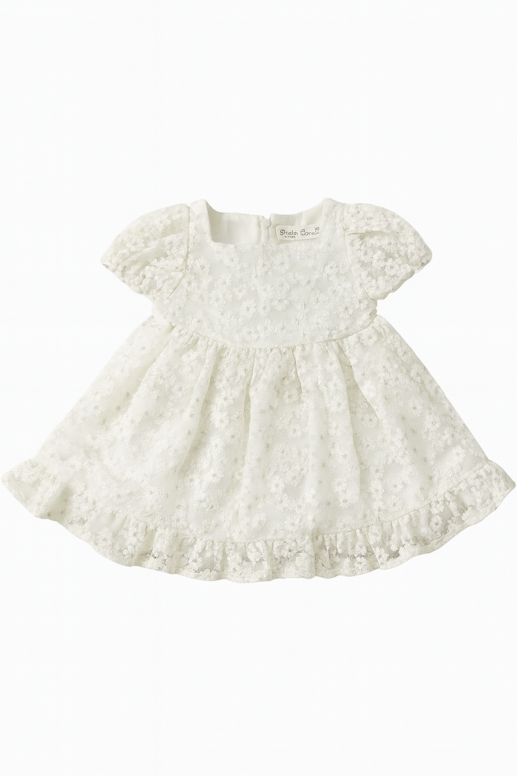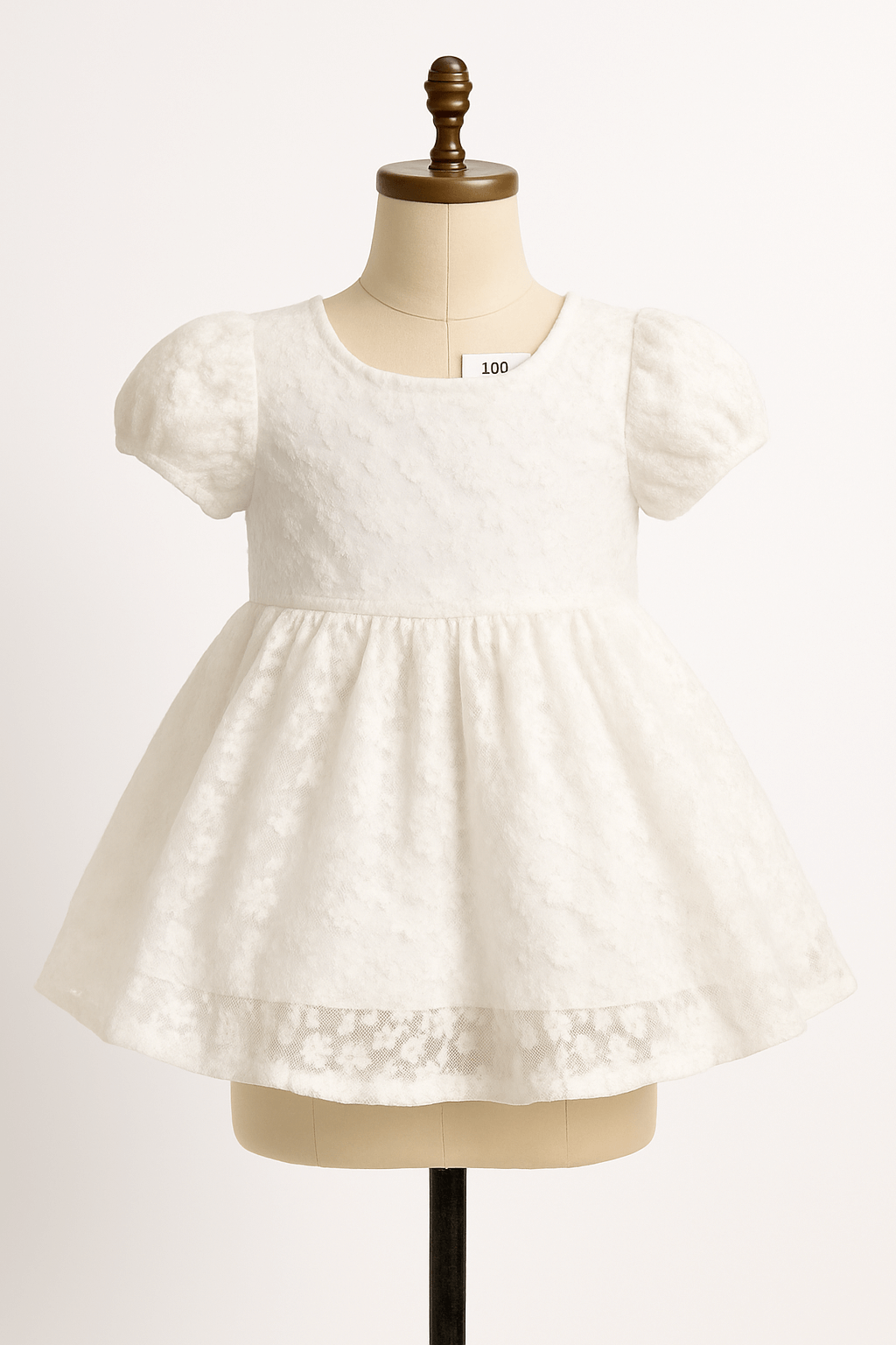 فستان دانتيل أبيض أنيق مصمم خصيصًا ليمنح طفلتك الصغيرة إطلالة ملكية مفعمة بالبراءة والجمال. يتميز بتطريزات دانتيل ناعمة من الخارج مع بطانة قطنية مريحة من الداخل، ليجمع بين الفخامة والراحة. يأتي بأكمام قصيرة منفوشة تمنح مظهرًا أنثويًا رقيقًا، بالإضافة إلى تنورة كشكش منفوشة تضيف لمسة ملوكية ساحرة. خفيف ومناسب لحفلات المناسبات الخاصة مثل الأعياد وأعياد الميلاد