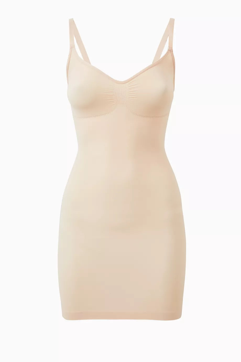 فستان تحتي بسيط بلون بيج بتصميم ضاغط ناعم يساعد على تنسيق القوام تحت الملابس. مصنوع من خامة مرنة وخفيفة تسمح بالتهوية، وبيتميز بحمالات رفيعة قابلة للتعديل لتناسب مختلف المقاسات.