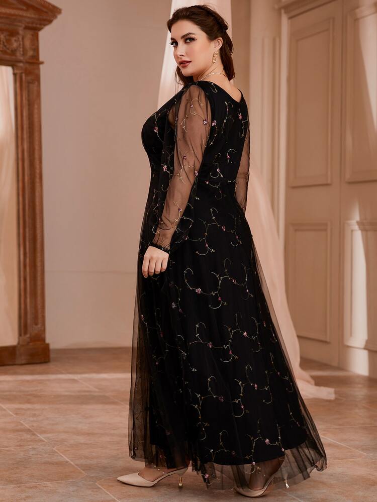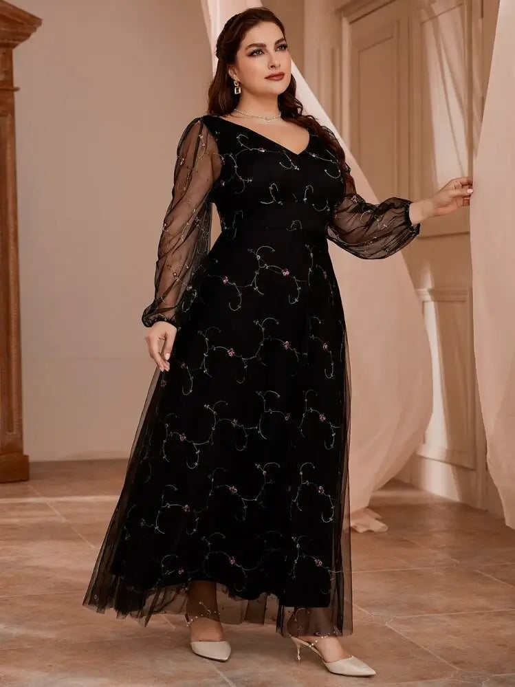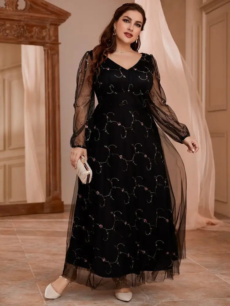 فستان أنيق بلون أسود كلاسيكي، يتميز بتفاصيل هادئة بتطريزات دقيقة تضيف لمسة رقيقة للّوك. الأكمام الشفافة الطويلة بتدي إحساس أنثوي ناعم، والقَصّة منسابة بانسيابية خفيفة بتدي مظهر متوازن ومريح في نفس الوقت. الإطلالة كلها بتعبر عن ذوق راقي وهدوء بسيط في التفاصيل.