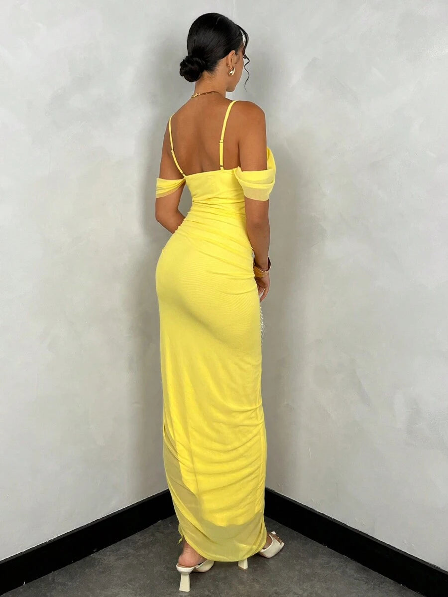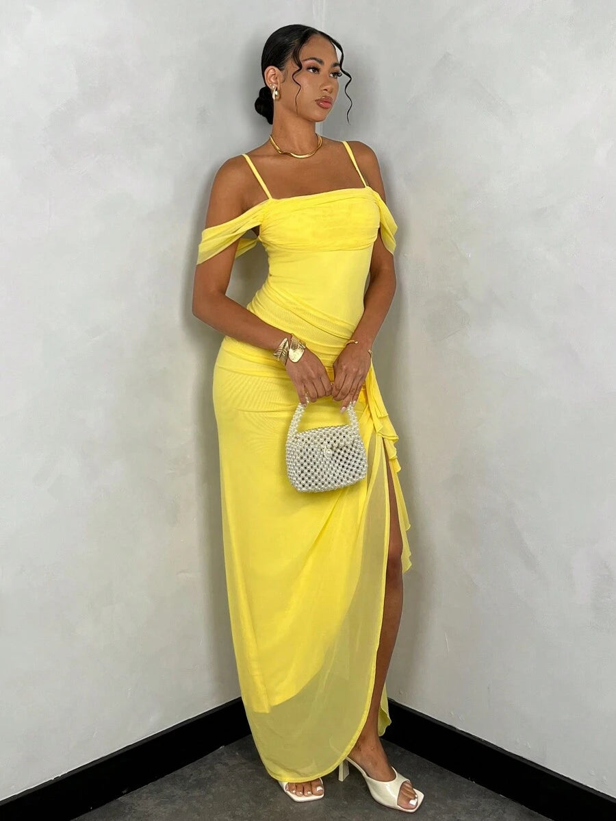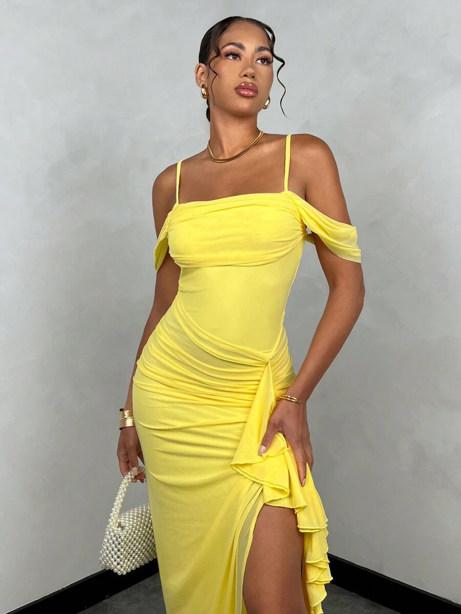 فستان طويل بلون أصفر ساطع بتصميم برقبة منسدلة وحمالات رفيعة، مع أكمام جانبية خفيفة مرتبطة بشريط. الجزء السفلي مزين بكشكشة على جانب واحد وفتحة طويلة من الأمام بتمنح حرية للحركة. القماش خفيف ومناسب للجو الدافئ، والتصميم بسيط بتفاصيل واضحة في القصّة والانسدال.