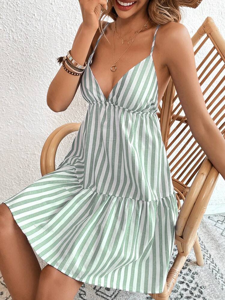 فستان صيفي مخطط بحمالات رفيعة وفتحة رقبة على شكل حرف V باللون الأخضر والأبيض