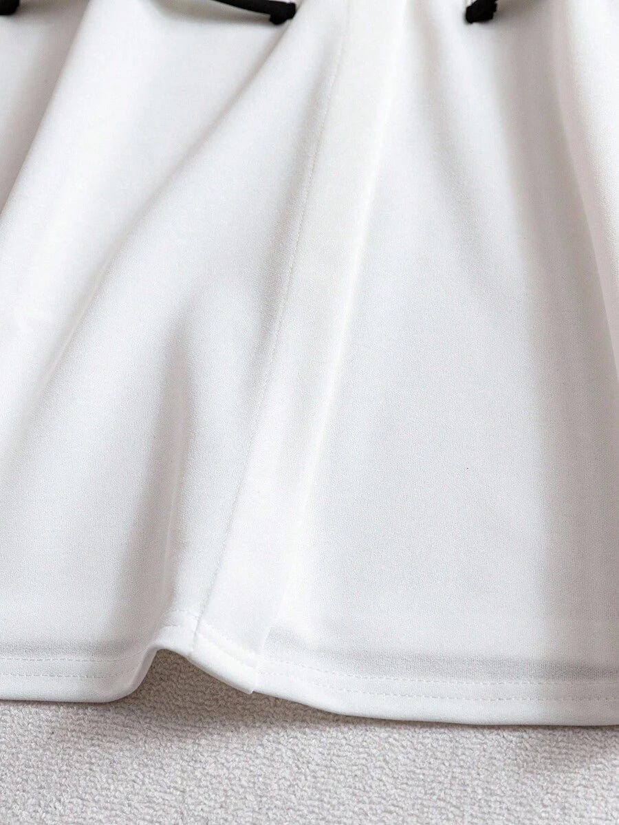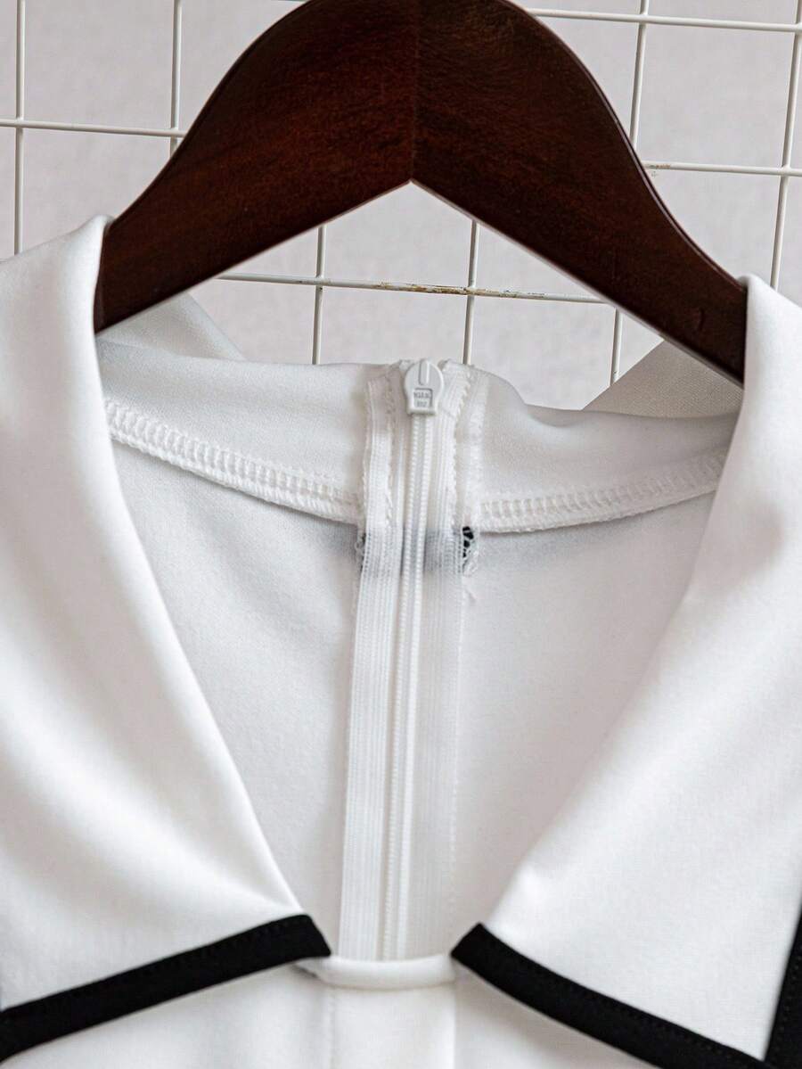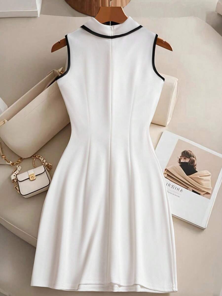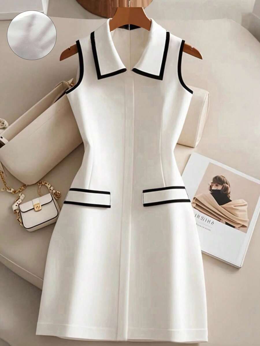 الفستان مصنوع من قماش ناعم بملمس ثابت يعطي مظهر أنيق ومنسق. تصميمه بسيط بلون أبيض مع خطوط سوداء دقيقة على الياقة والجيوب تضيف لمسة تباين راقية. القصة المستقيمة تعطي شكل مرتب يناسب الإطلالات الرسمية أو المناسبات الهادئة، كما أن عدم وجود أكمام يجعله مناسب للأجواء الدافئة.