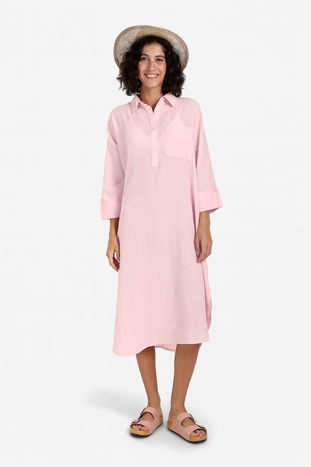 فستان طويل بتصميم قميص باللون الوردي الفاتح، مصنوع من خامة قطنية خفيفة ومريحة. يتميز بياقة كلاسيكية وأزرار أمامية ممتدة بطول الصدر، مع أكمام طويلة تعطيه طابع عملي وبسيط. تصميمه السادة يجعله مناسب للإطلالات الكاجوال أو للاستخدام اليومي.