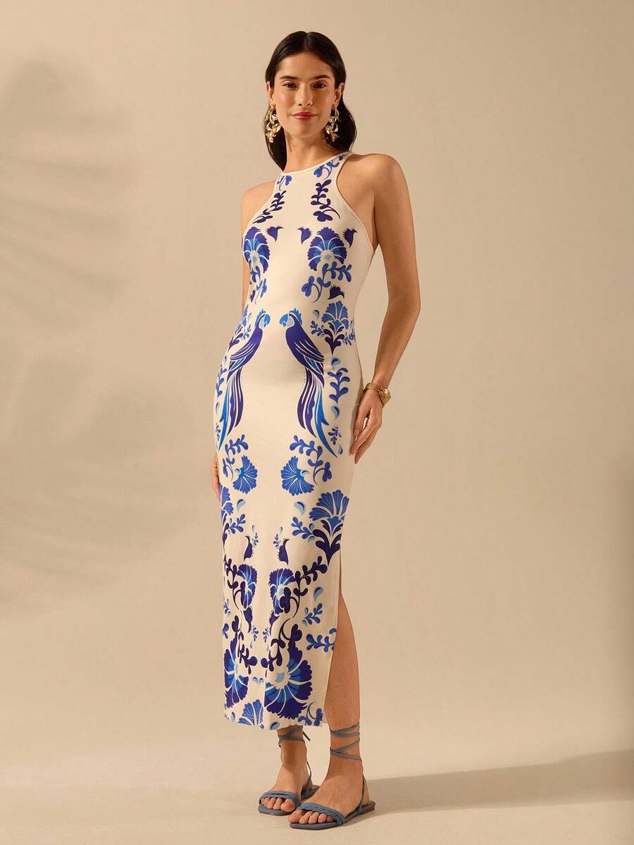 فستان CAJUNI بطبعة نباتات واستوائيات وببغاء ملوّن. تصميمه الأنيق بدون أكمام وقَصّته الضيّقة تمنحك مظهرًا أنثويًا رائعًا يناسب العطلات، الشاطئ، والإطلالات اليومية الكاجوال. خامة خفيفة ومريحة تجعل منه خيارك المثالي لأيام الصيف المشمسة. 🌴🐦