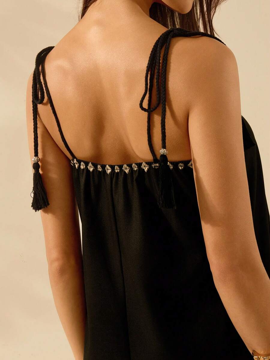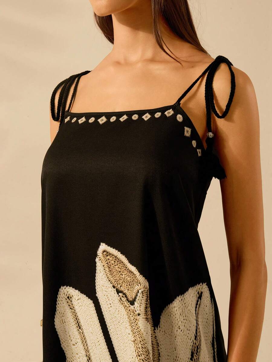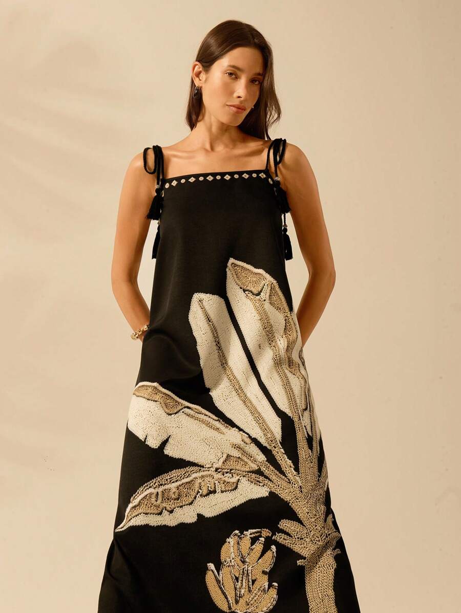 فستان CAJUNI بتصميم بوهو عصري وطبعة نخيل استوائي تضيف لمسة حيوية. يتميز بدون أكمام وشراشيب أنيقة لإطلالة كاجوال وعطلات مريحة. مثالي للشاطئ، السفر، أو المناسبات الصيفية اليومية. 🌞🌴
