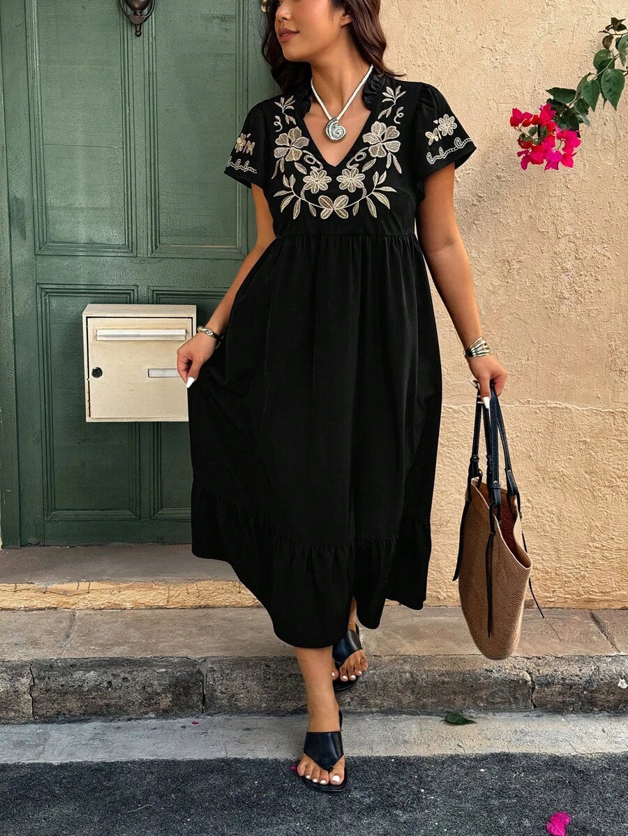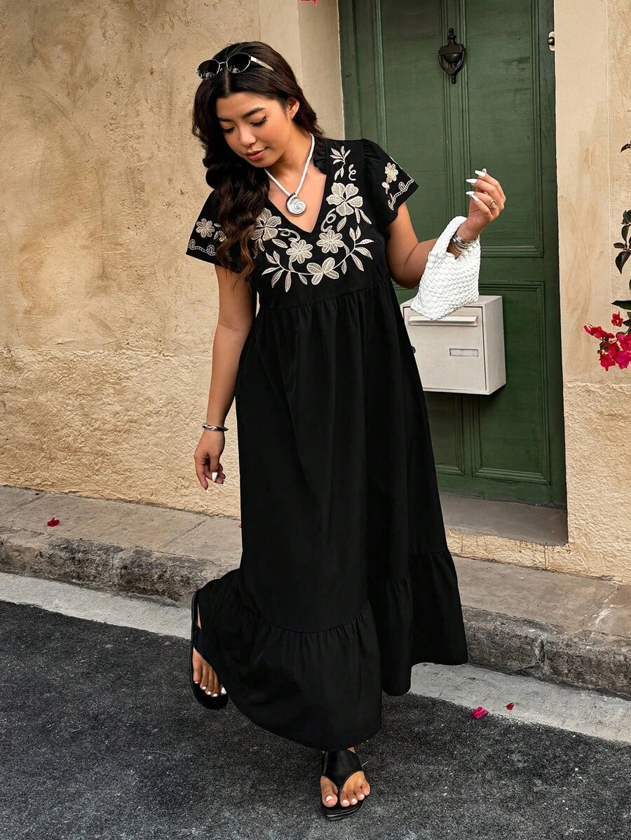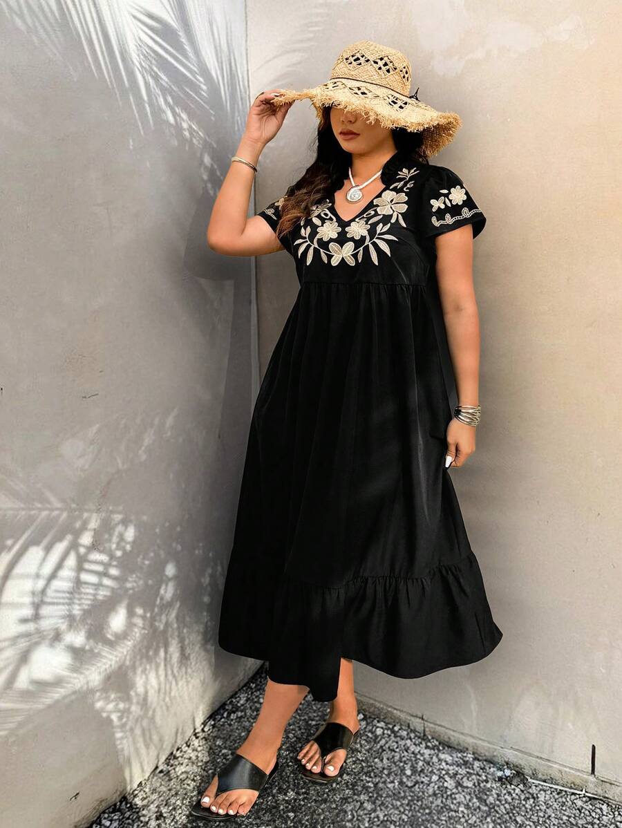 فستان مقاس كبير – أكمام قصيرة وتطريز زهري لإطلالة صيفية كاجوال
