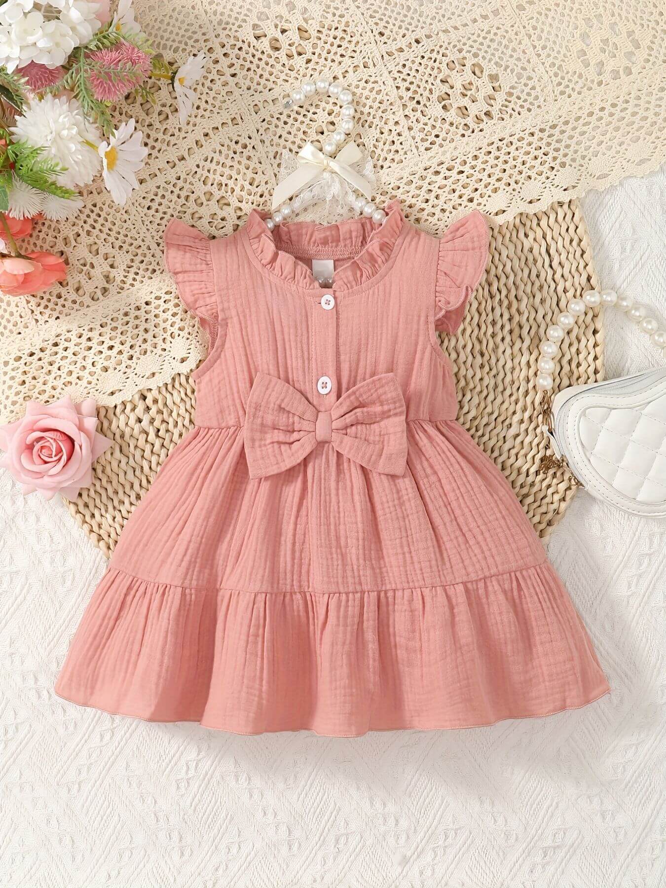 فستان منتفخ بأكمام قصيرة من القطن مزين بكشكشة للفتيات الصغيرات مع فيونكة