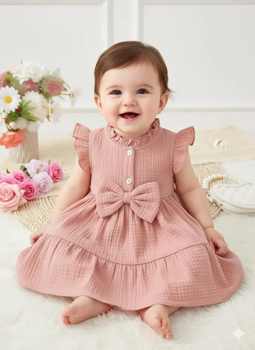 الفستان بتصميمه المنفوش الذي يضفي طابعًا احتفاليًا وجذابًا، مع أكمام قصيرة مناسبة للمواسم الدافئة. وتأتي الكشكشة الرقيقة كزينة ناعمة تضيف له لمسة من الحيوية والأنوثة، في حين تمنح الفيونكة البارزة لمسة ساحرة تجعل صغيرتك تبدو كأميرة صغيرة.
