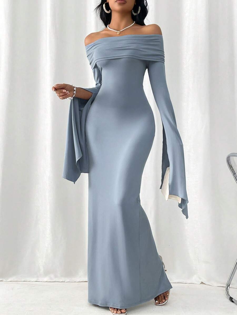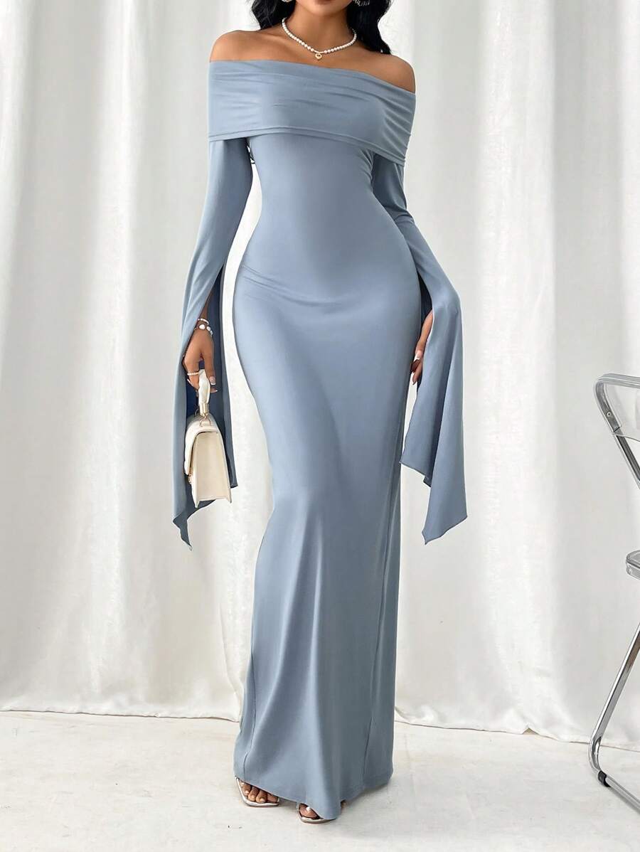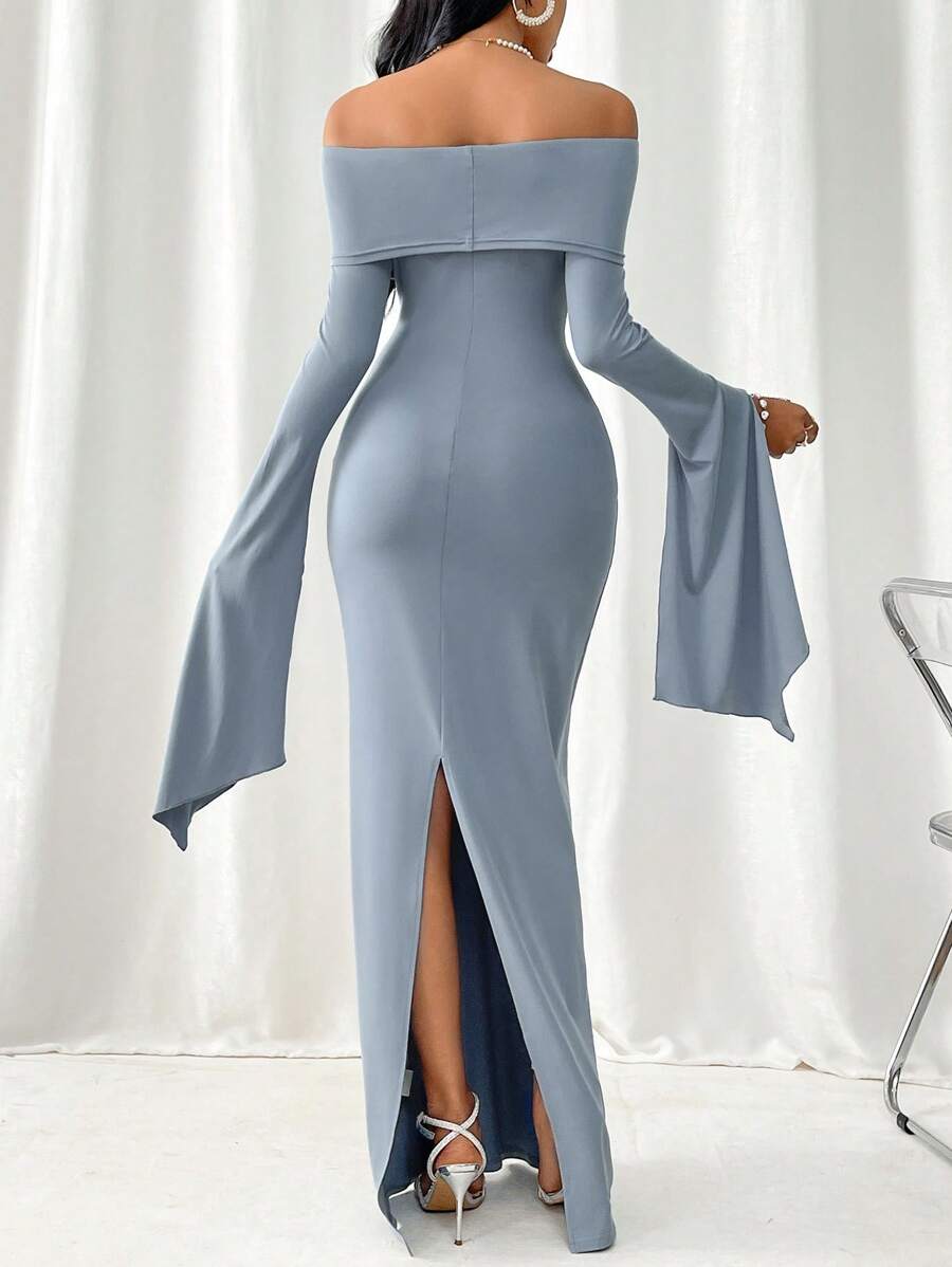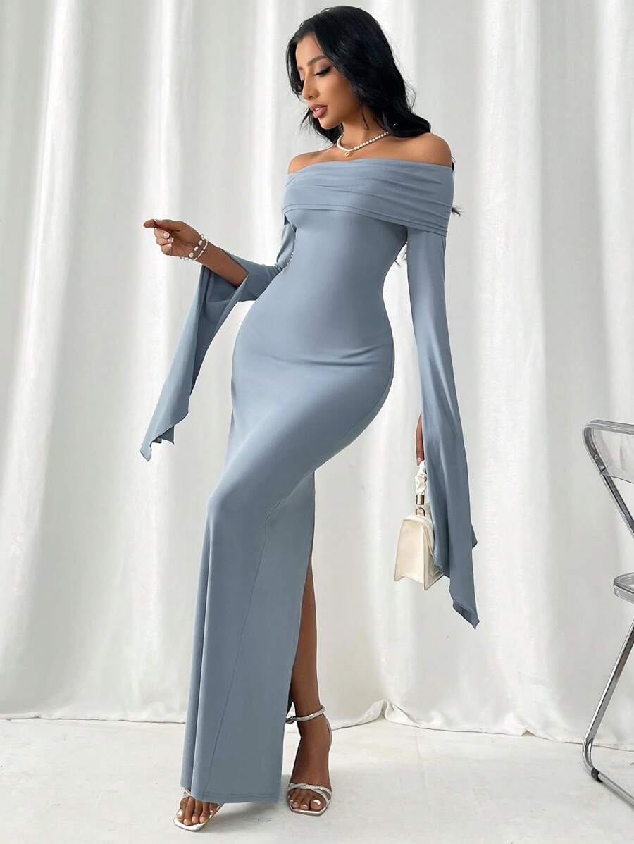 فستان نسائي بأكتاف مكشوفة وأكمام طويلة مطوية مع فتحة جانبية أنيقة من Firerie