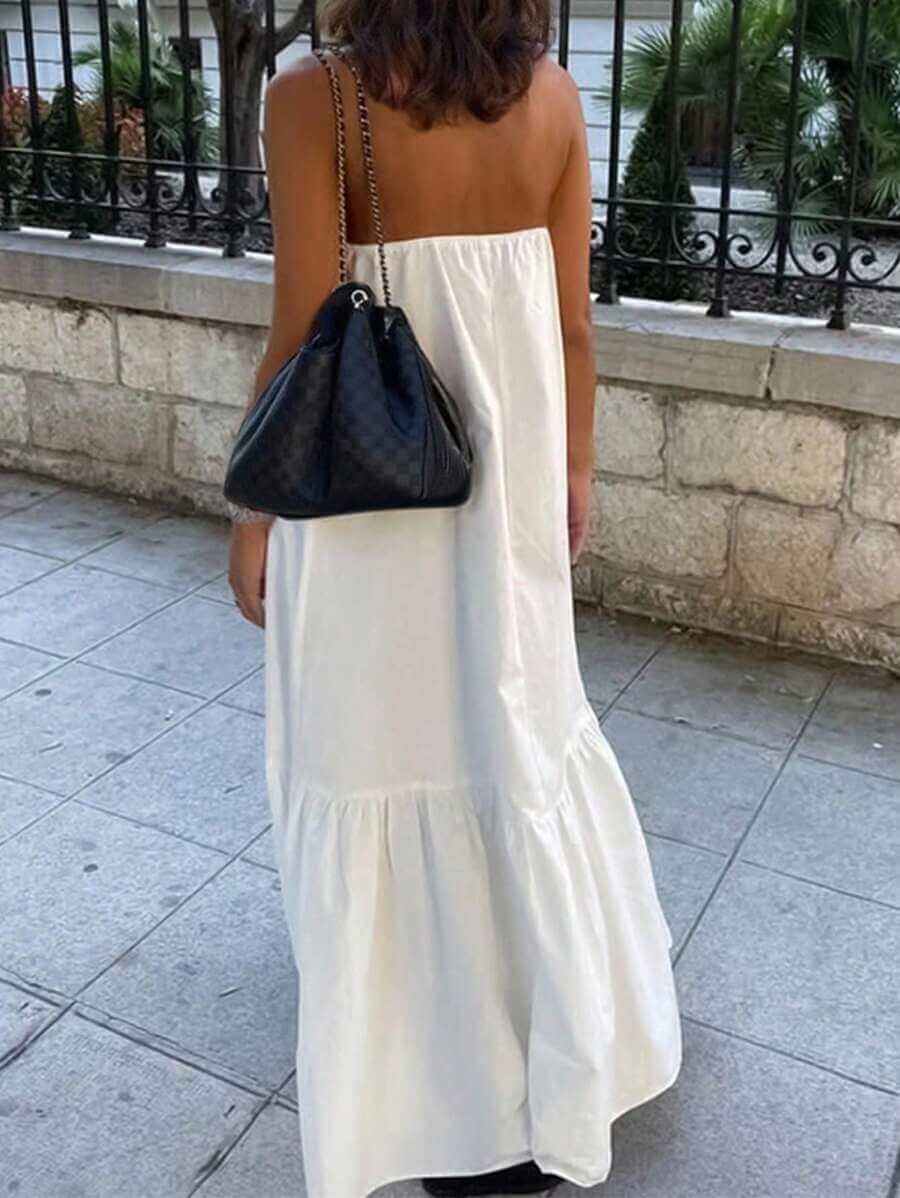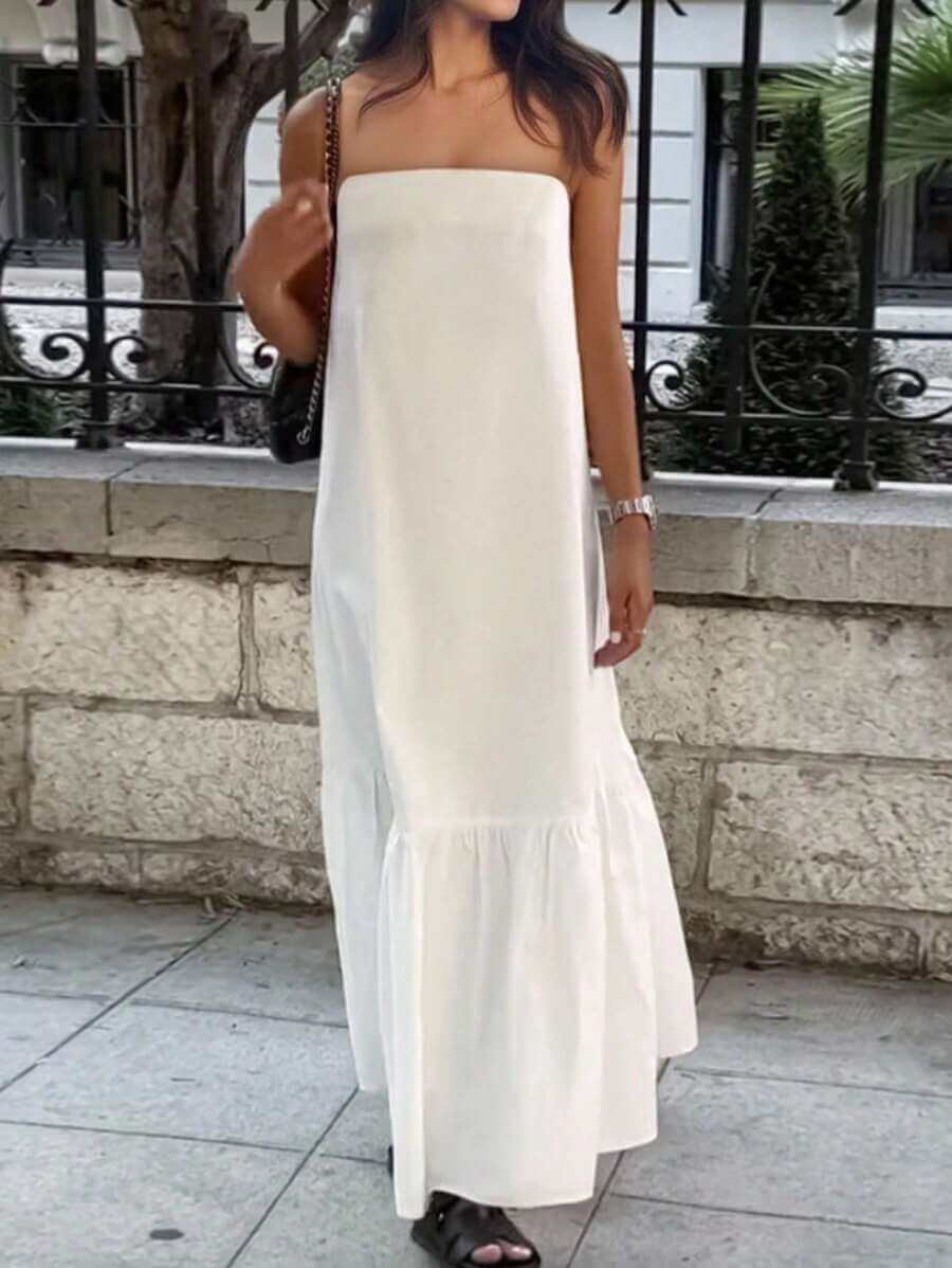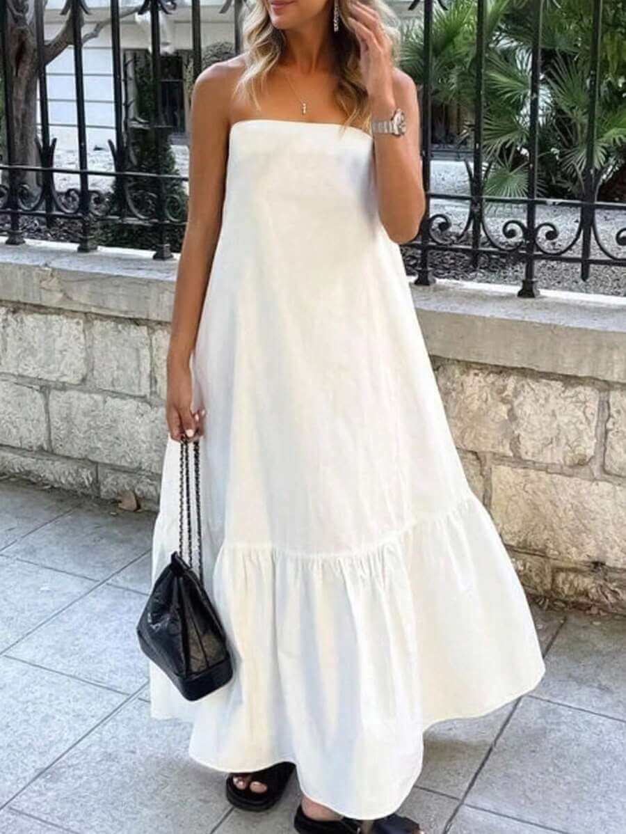 فستان طويل بلون أبيض سادة، بتصميم مستقيم بدون حمالات وبجزء سفلي واسع بسيط. القماش خفيف ومناسب للأجواء الدافئة، والتصميم بيظهر بشكل انسيابي من الأعلى للأسفل. يمكن تنسيقه مع صندل أو حقيبة صغيرة لإطلالة هادئة وغير متكلفة.
