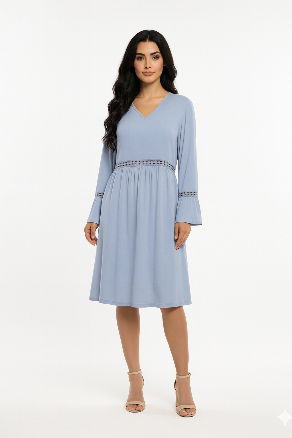 الفستان مصنوع من قماش خفيف بلون أزرق سماوي، يتميز بقصة واسعة من الأسفل وخط خصر مرتفع مزين بتفاصيل دانتيل بسيطة. الأكمام طويلة وواسعة قليلًا عند الأطراف، ما بيدي شكل مريح ومتناسق. الطول تحت الركبة بيخليه مناسب للاستخدام اليومي أو المناسبات البسيطة بأناقة هادئة.