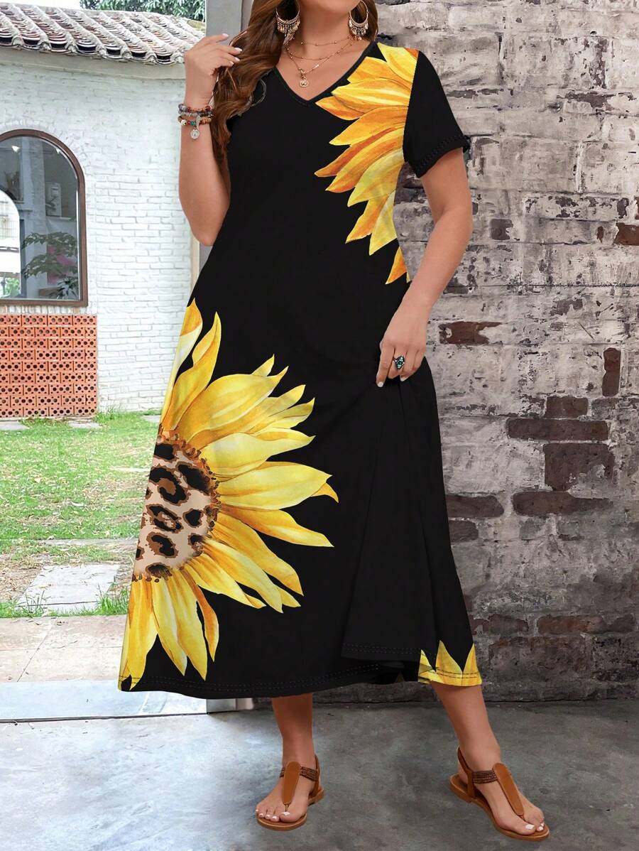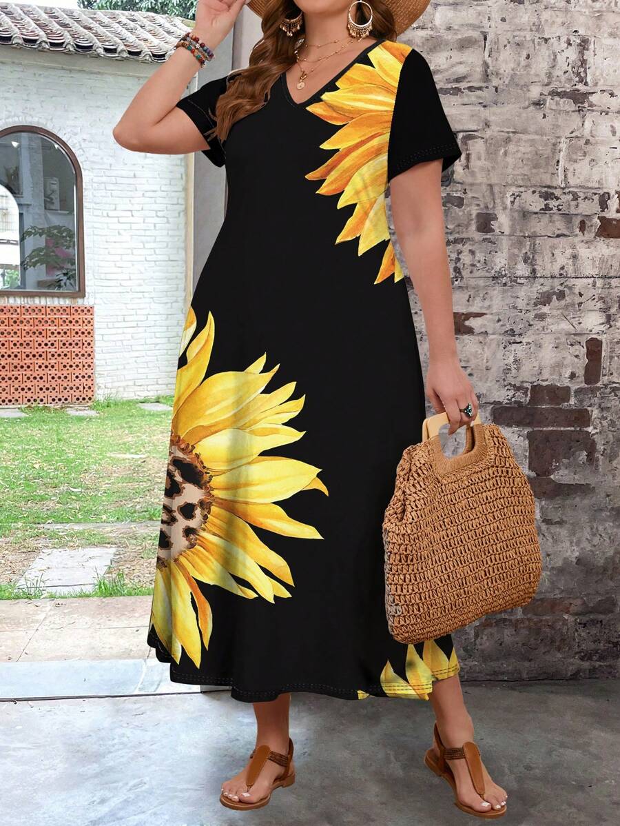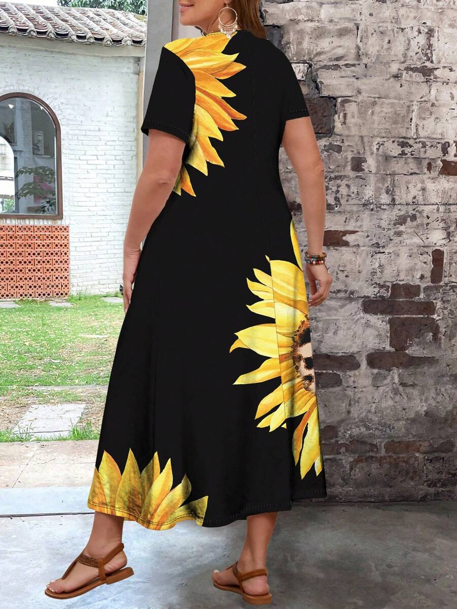 فستان نسائي طويل ملائم بنقشة زهور عباد الشمس من SHEIN VCAY
