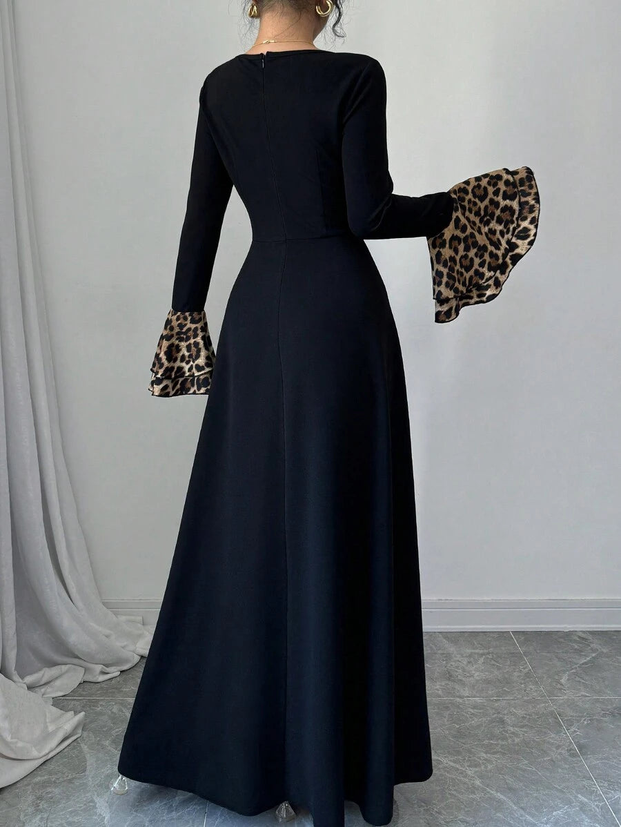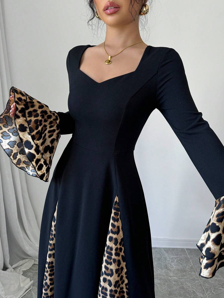 تألقي بإطلالة جريئة وأنيقة مع هذا الفستان الطويل من Modelyn. يتميز بطبعة جلد الفهد (Leopard Print) متباينة الألوان (Contrast Color Splice)، مع فتحة رقبة قلبية (Sweetheart Neck) وأكمام طويلة لإطلالة أنثوية كلاسيكية.
