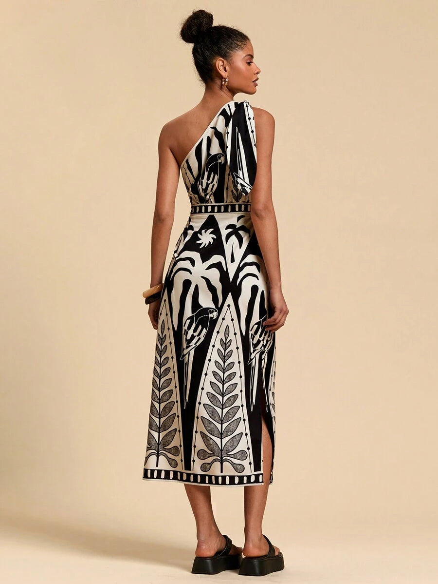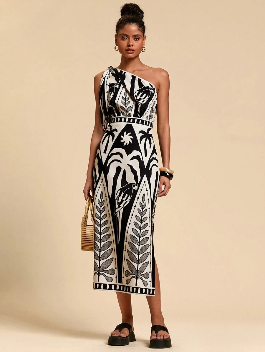 فستان Travachic نسائي طويل – كتف واحد، حزام رباط، بطبعة استوائية، تصميم فضفاض