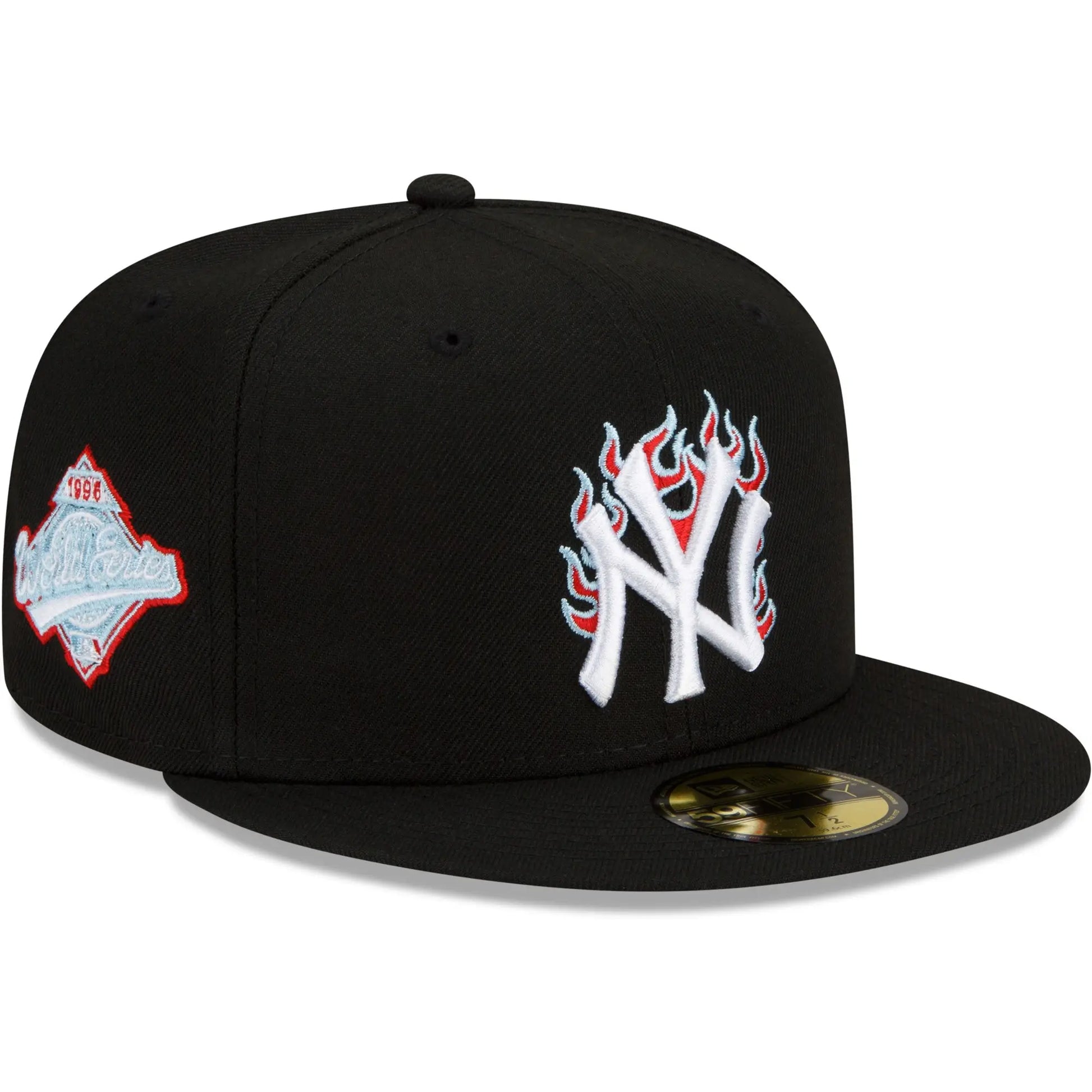 القبعة مصممة من قماش باللون الأسود الكلاسيكي مع شعار مطرز باللون الأبيض يحيط به نقشة لهب بألوان متدرجة. تتميز بحافة عريضة مستقيمة تضيف لمسة عصرية،