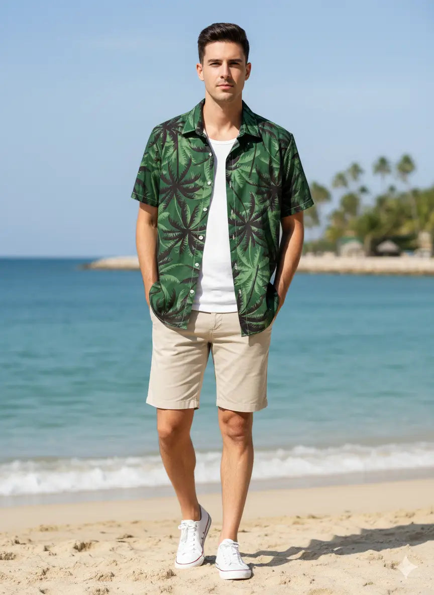 قميص صيفي رجالي من Shein بتصميم بأكمام قصيرة ونقشة أوراق نخيل تعكس روح البحر والأجواء الصيفية. يتميز بخامة خفيفة ومريحة مثالية للأيام الحارة، ويمنحك إطلالة كاجوال عصرية تناسب الشاطئ أو الخروجات اليومية.