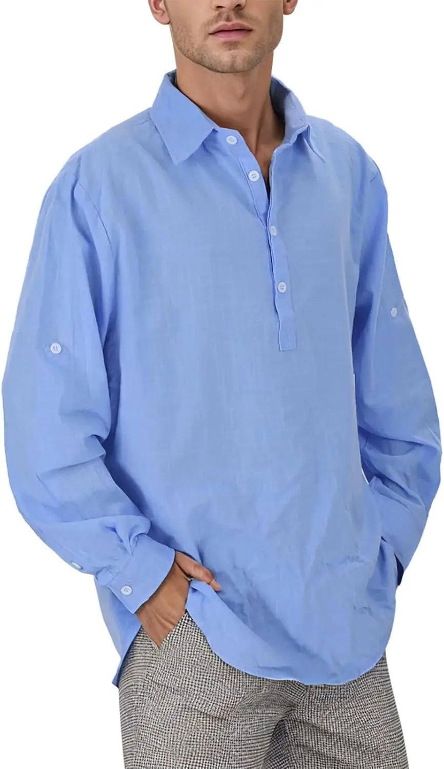 قميص رجالي بتصميم فضفاض من خامة خفيفة ومريحة، يتميز بلون أزرق هادئ يضفي لمسة عصرية وأنيقة في نفس الوقت. مزود بياقة كلاسيكية مع أزرار نصفية أمامية، وأكمام طويلة قابلة للطي مع أزرار للتثبيت، ما يجعله عملي ومناسب للارتداء اليومي أو الطلعات الكاجوال. تصميمه البسيط يمنحك حرية تنسيقه مع بنطلونات قماش أو جينز لإطلالة متجددة.