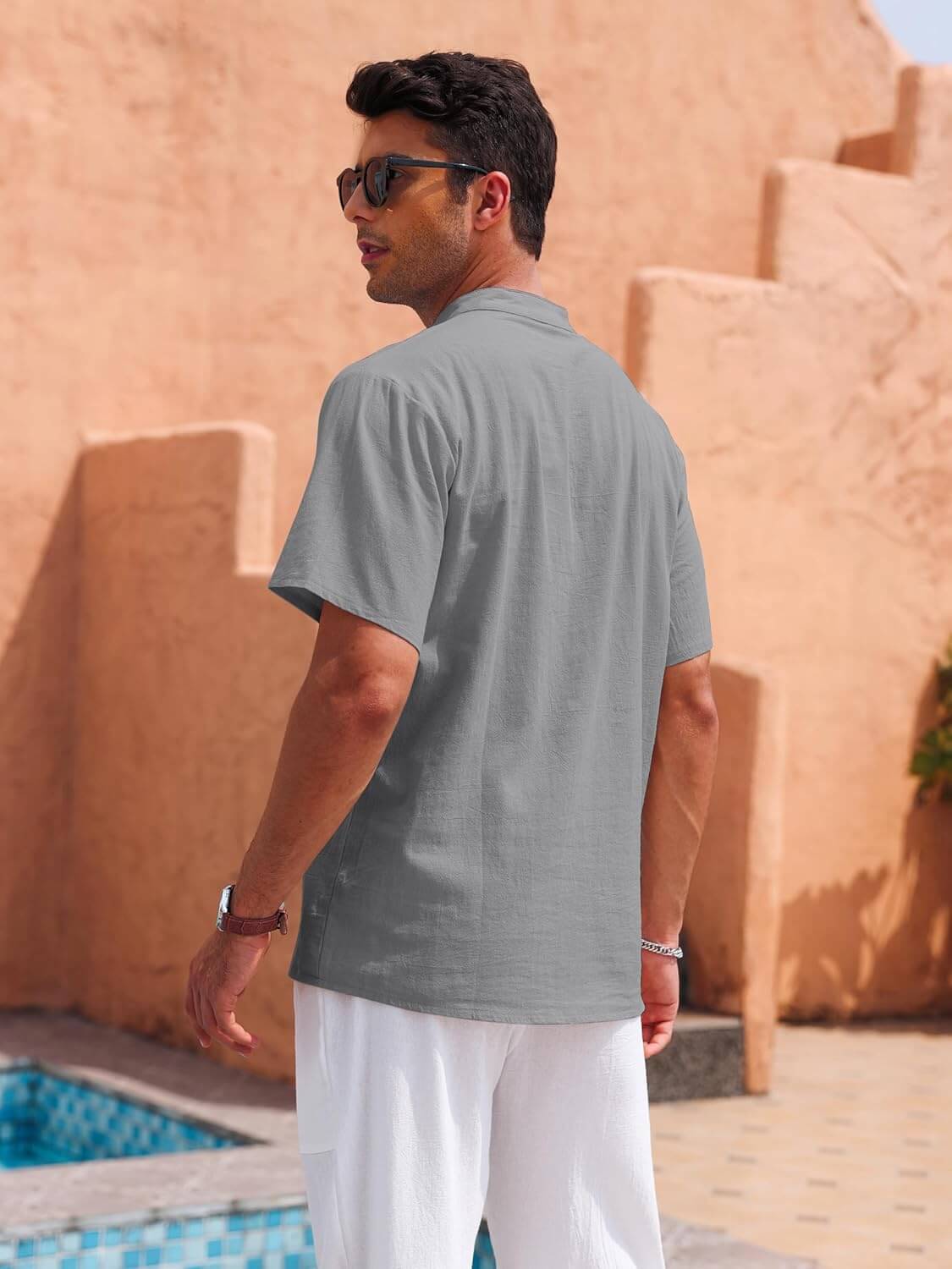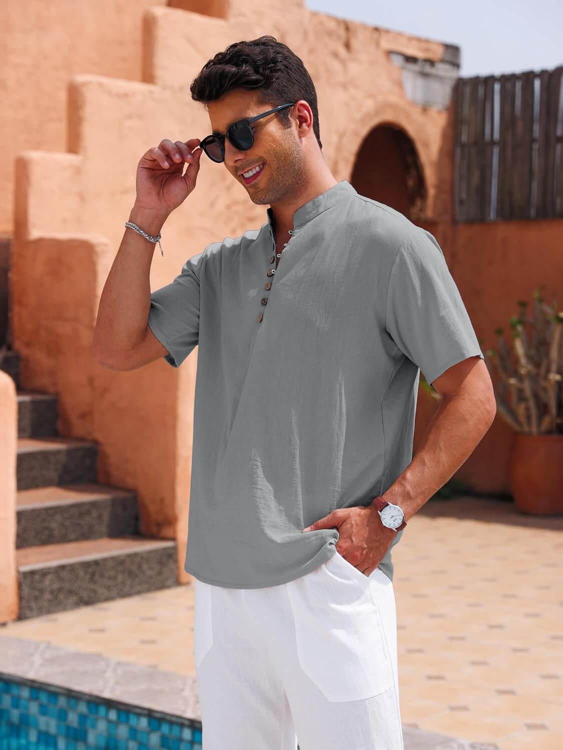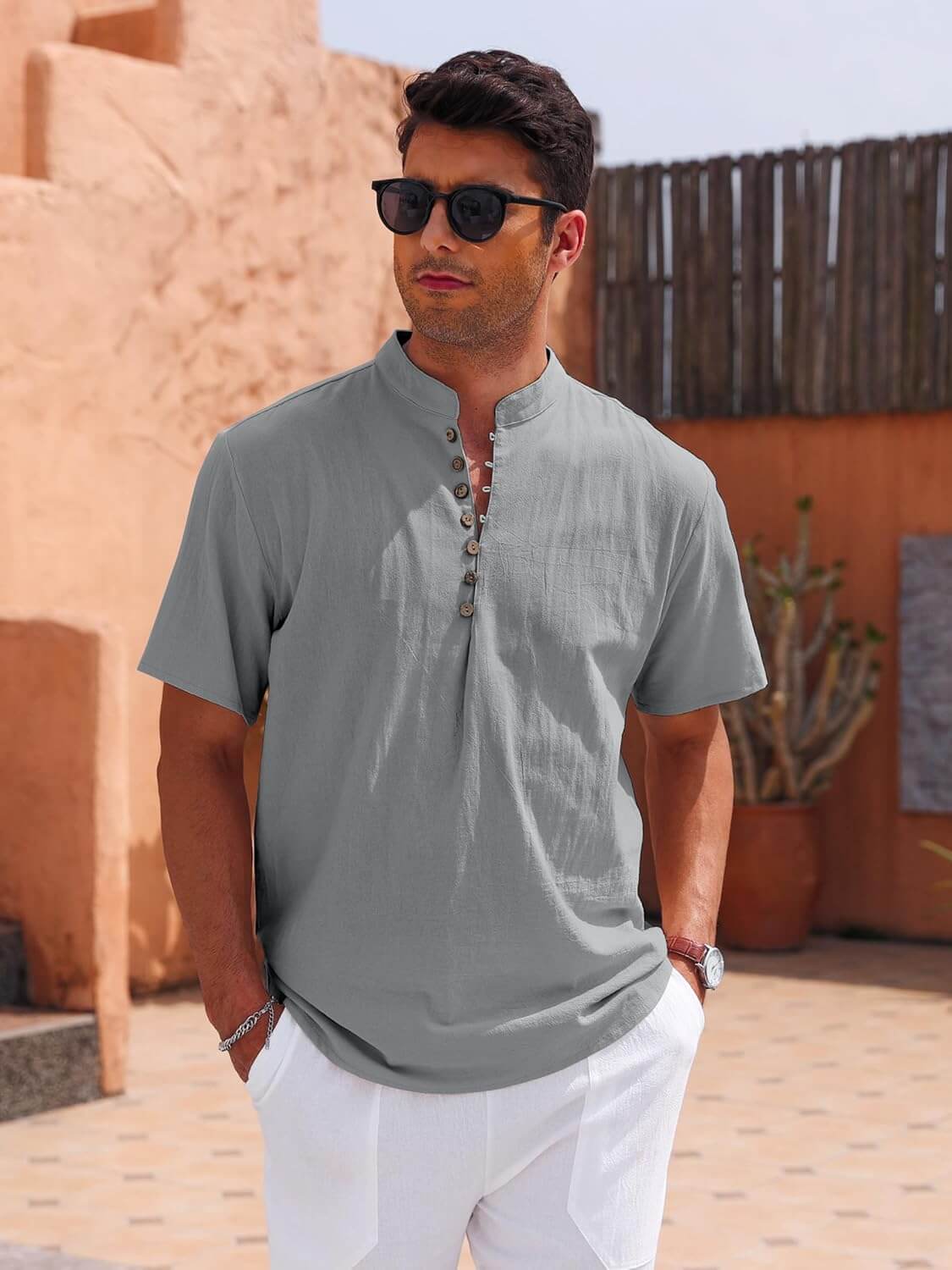 قميص رجالي عصري من Shein باللون الرمادي، يتميز بياقة صينية أنيقة وأزرار أمامية تضيف لمسة كلاسيكية مميزة. مصنوع من قماش قطني خفيف وناعم يوفر الراحة والتهوية في الأجواء الحارة، مع تصميم نصف كم يمنح حرية حركة مثالية لإطلالة كاجوال أنيقة تناسب الخروجات اليومية أو العطلات الصيفية.