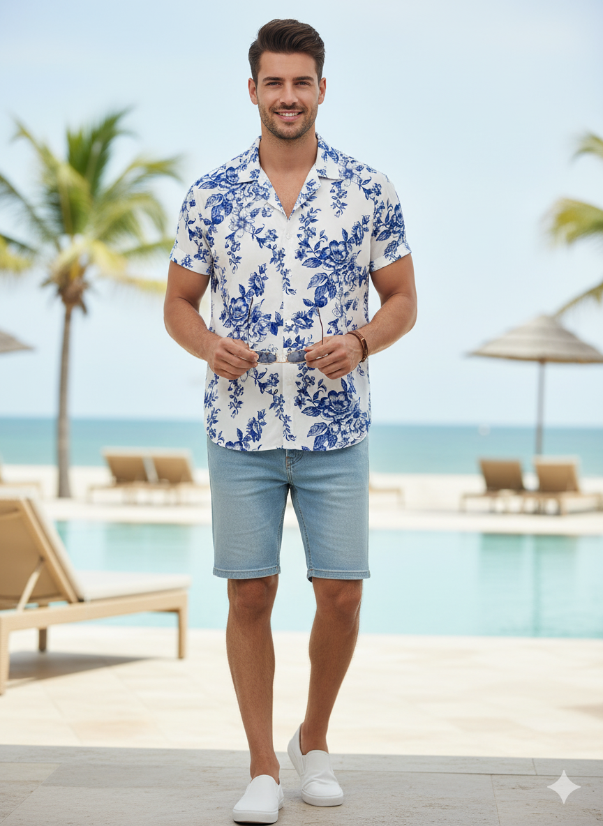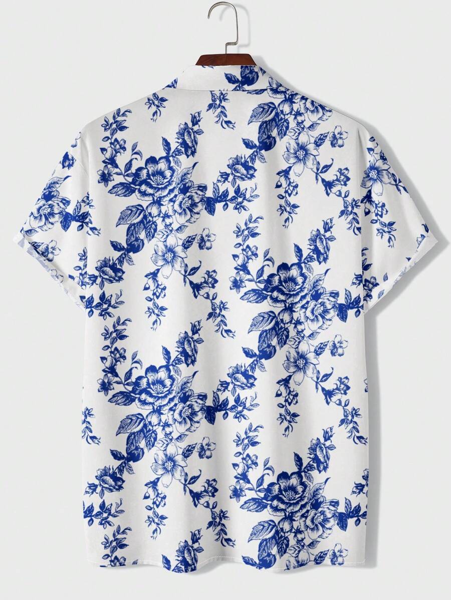 قميص قصير بأكمام قصيرة من Shein بتصميم كلاسيكي مريح مطبوع بالكامل بنقشة زهور باللون الأزرق لإطلالة صيفية منعشة. يتميز بياقة تقليدية وأزرار أمامية لسهولة الارتداء، وخامة خفيفة تسمح بالتهوية مما يجعله مثالي للإطلالات الكاجوال أو الخروجات النهارية في الأجواء الدافئة.