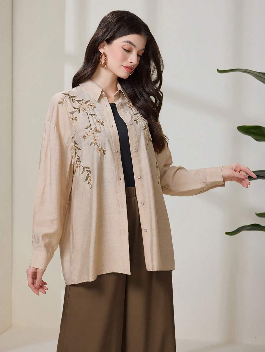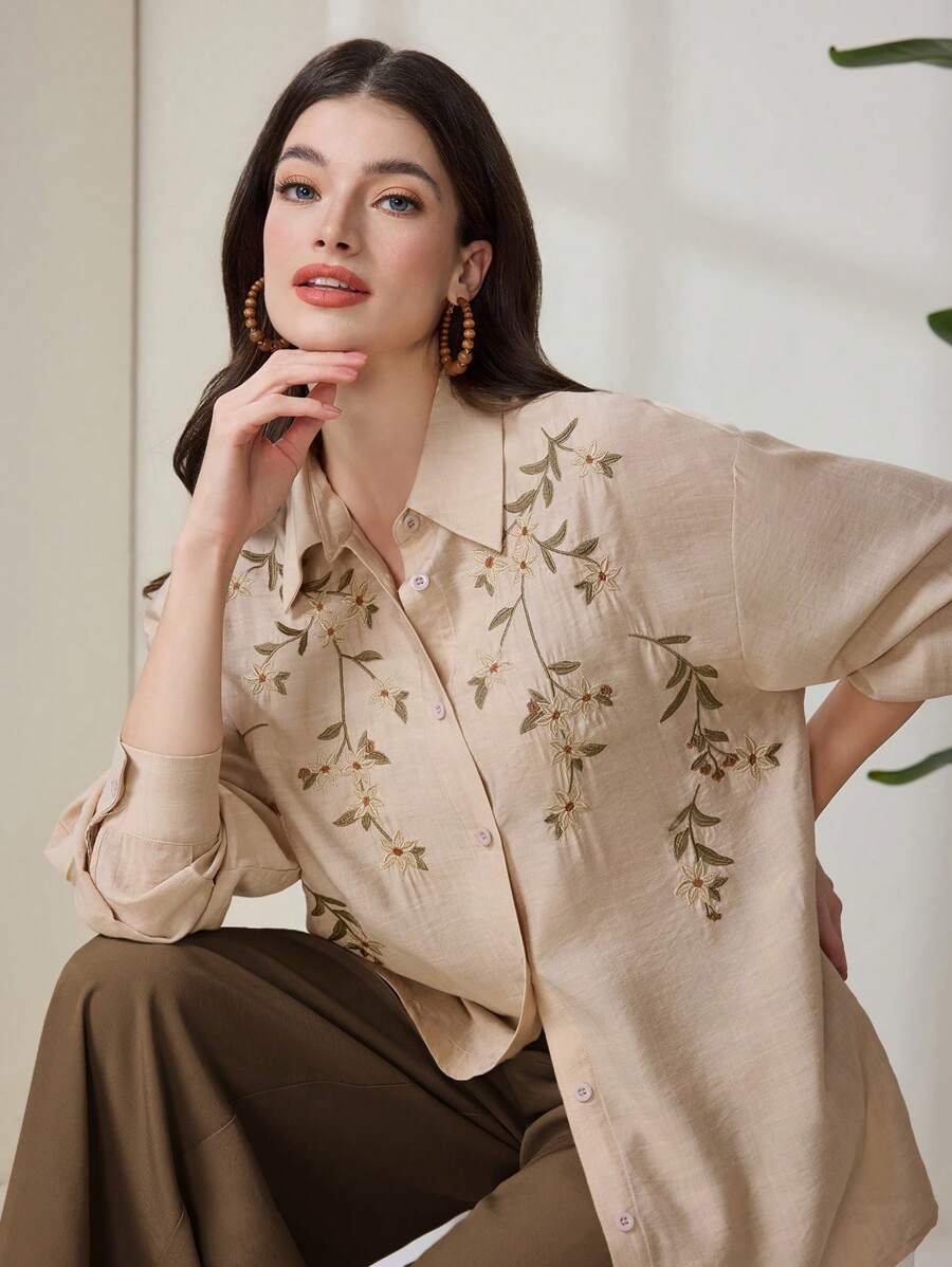 قميص نسائي كاجوال بأزرار من Veilorie بأكمام دولمان مطرزة بنباتات من shein