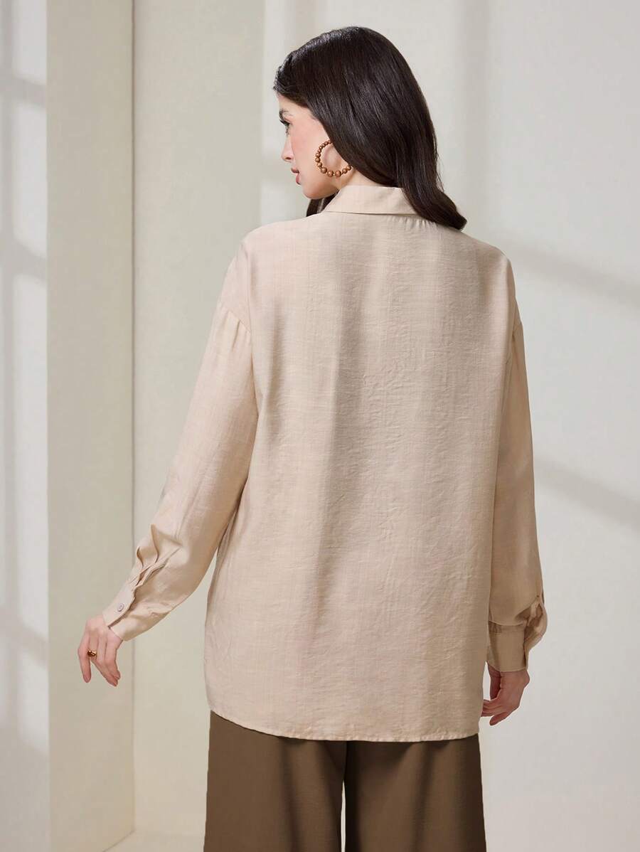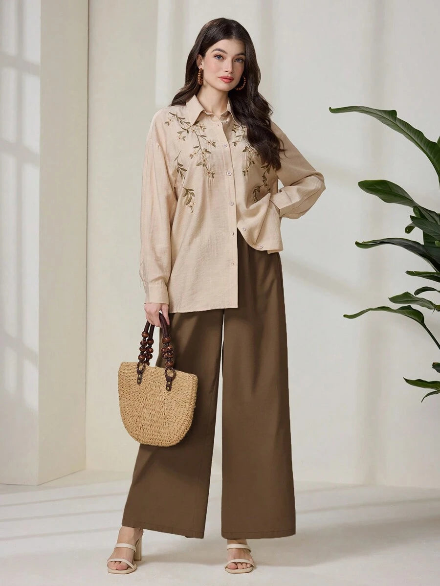 قميص ناعم بتصميم أنثوي راقي من Veilorie، بلون بيج هادئ وتطريز نباتي أنيق يضيف لمسة طبيعية ساحرة 🌿. القصة الواسعة والأكمام الدولمان بتدي حرية حركة وشكل انسيابي مريح، والخامة خفيفة وناعمة على البشرة. مثالي للإطلالات اليومية أو الخروجات البسيطة، خصوصًا مع بنطلون واسع أو جينز لإطلالة كاجوال أنيقة جدًا ✨.
