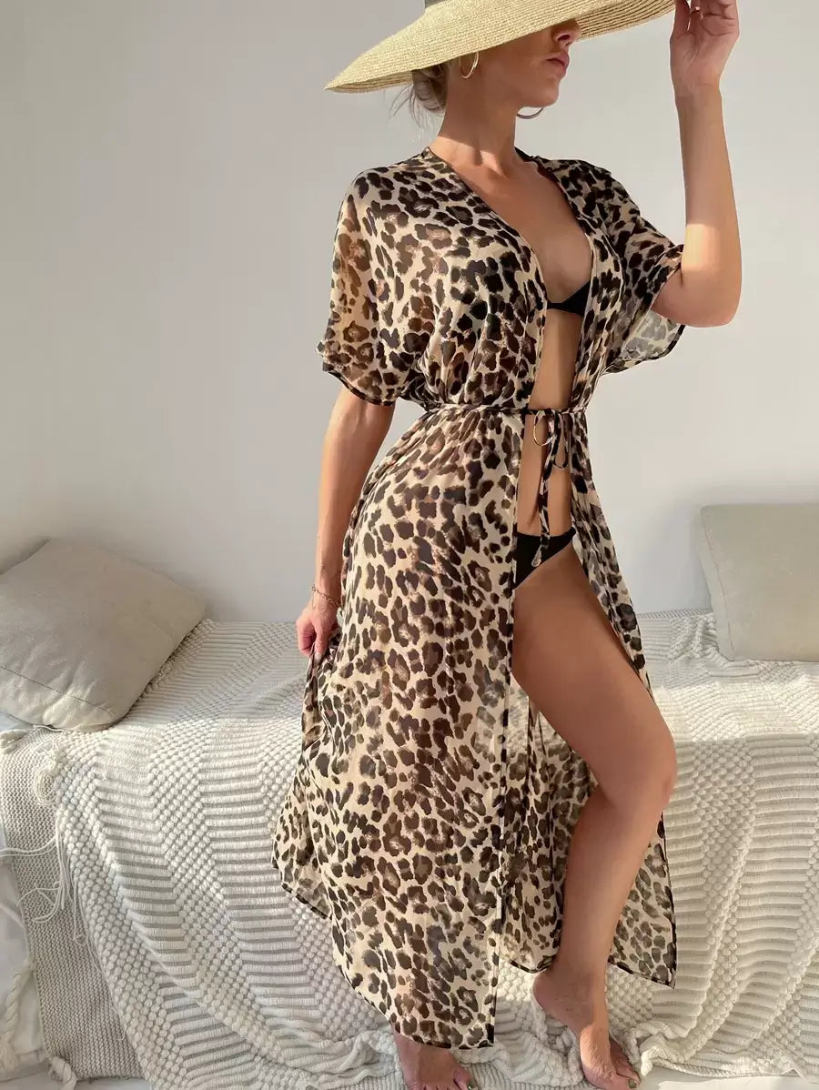 كيمونو بحزام قابل للفصل من الشيفون بنقشة جلد النمر للسباحة والشاطئ الصيفي