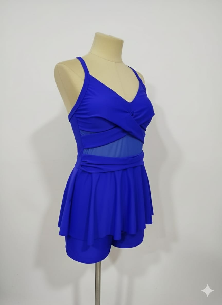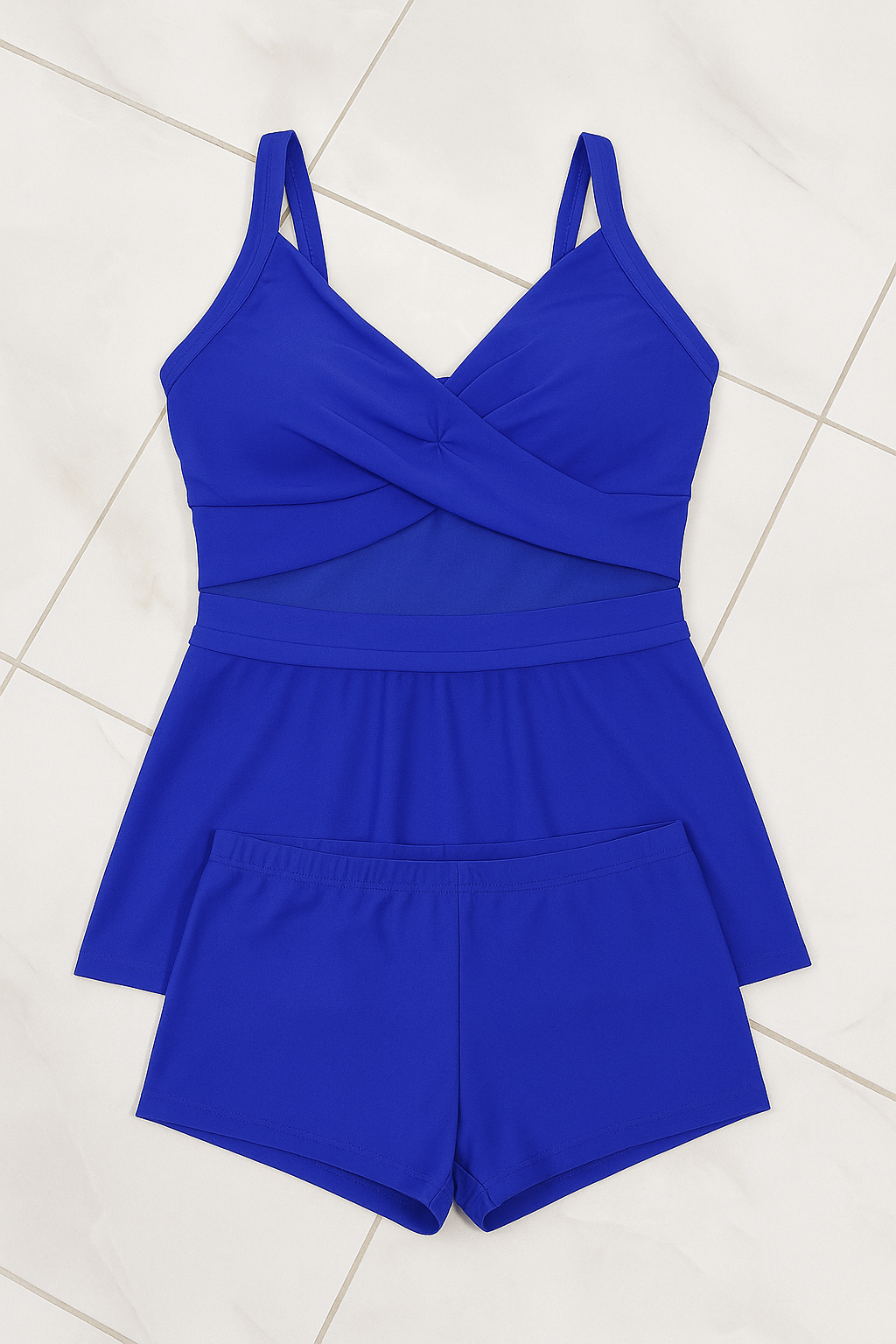 مايوه أنيق من Shein، المصمم من قطعتين توب بكسرات على شكل X من الأمام مع شورت داخلي لمزيد من الراحة والثقة في الحركة. يتميز بقصة عملية تغطي الجسم بشكل أنثوي أنيق، مع خامة ناعمة ومطاطية تمنح حرية حركة مثالية
