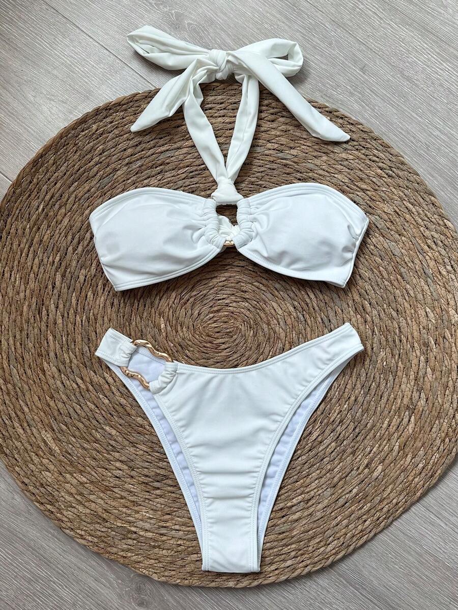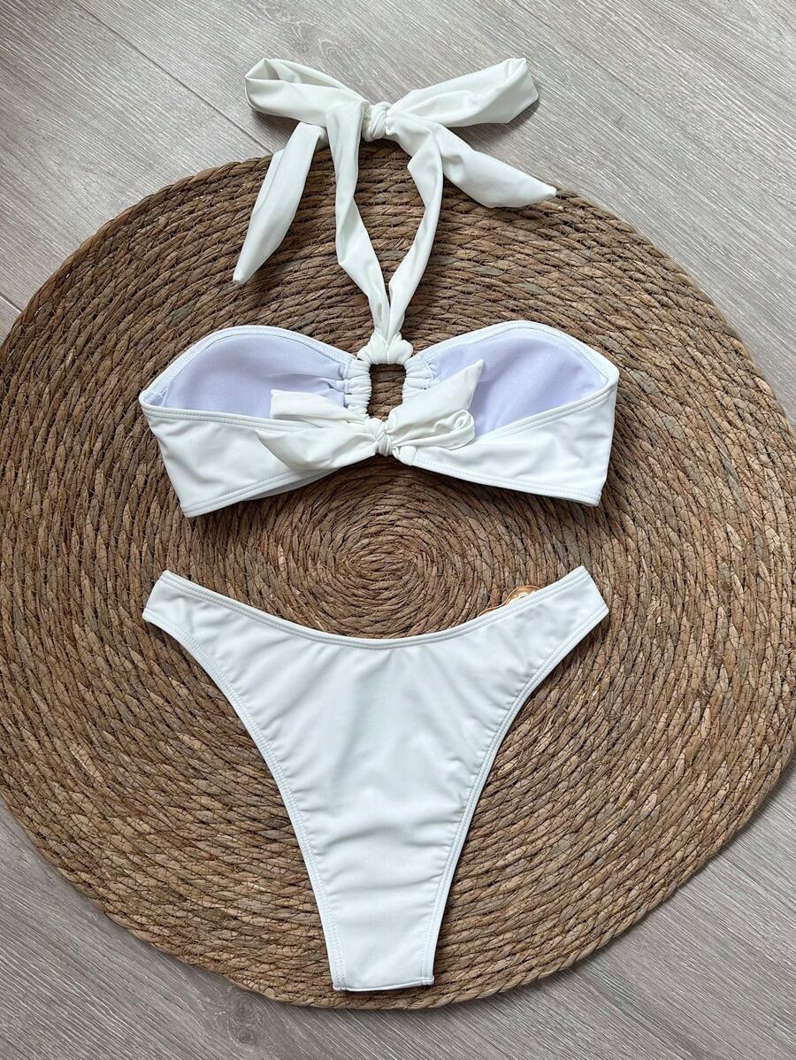 مايوه نسائي أبيض مثير بتصميم هالتر نِك – لون سادة أنيق لإطلالة صيفية راقية