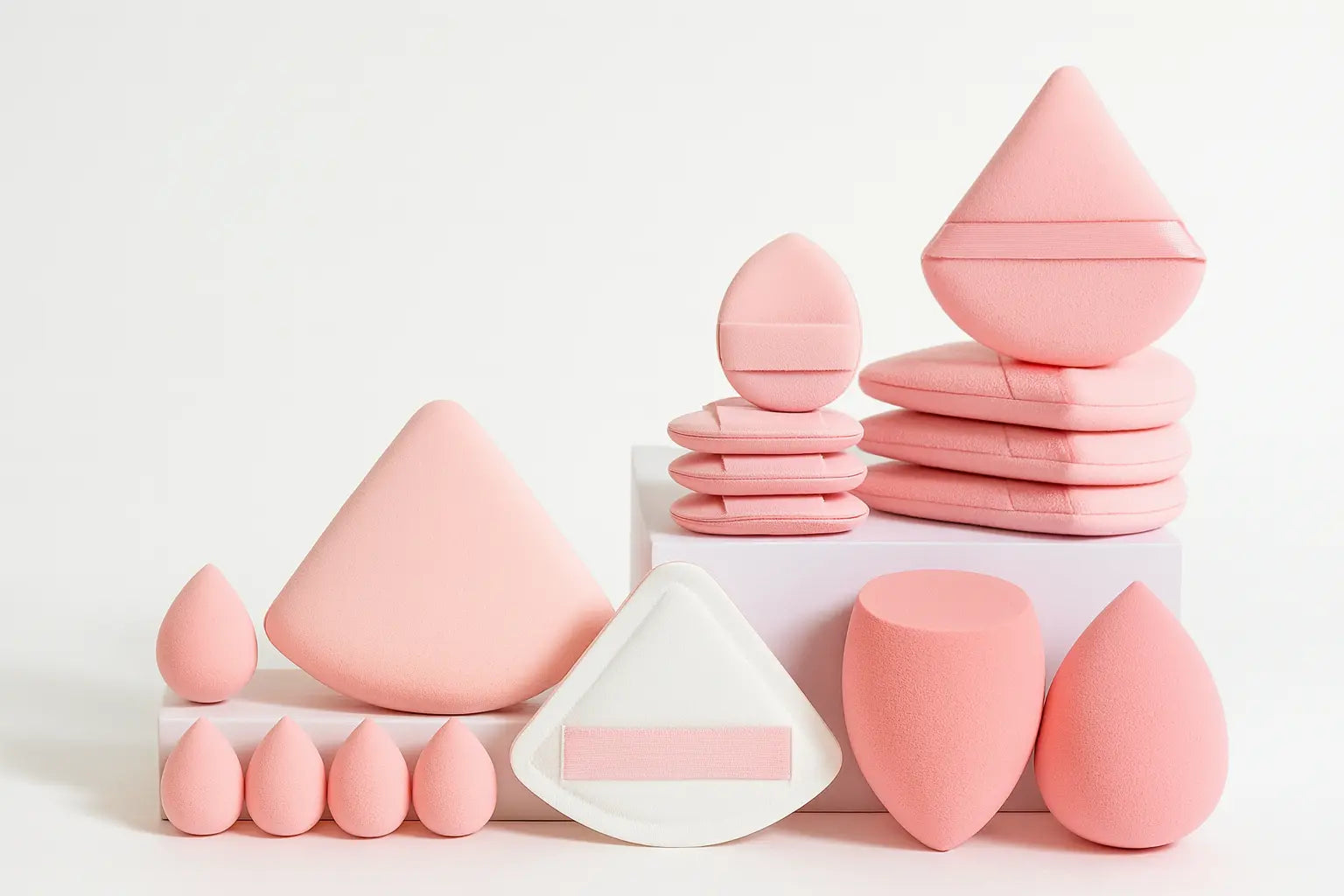 إسفنجات وأدوات وضع المكياج (Makeup Sponges & Puffs) باللون وردي ، وهي مصممة بأشكال مختلفة لتلبية احتياجات متعددة في تطبيق المكياج