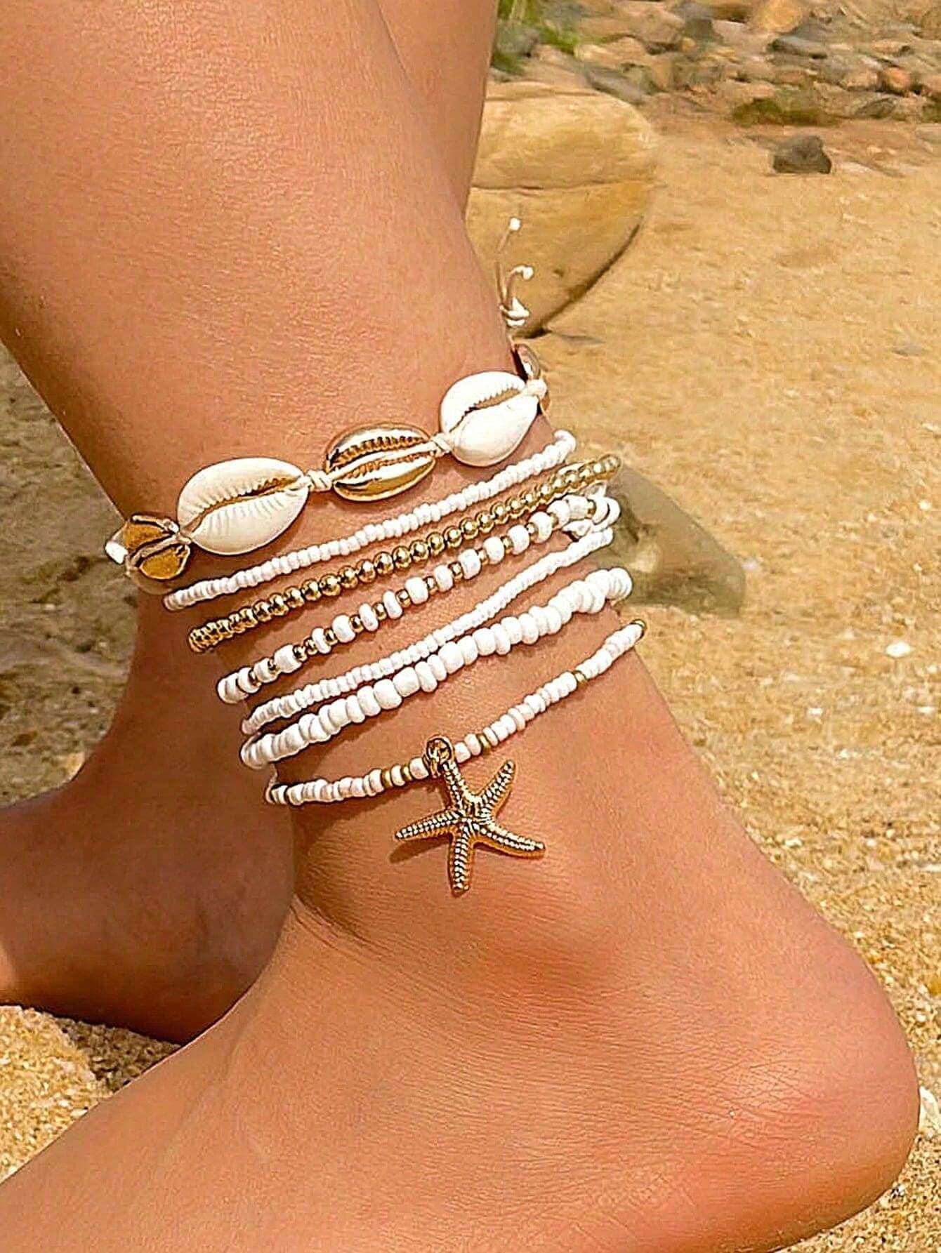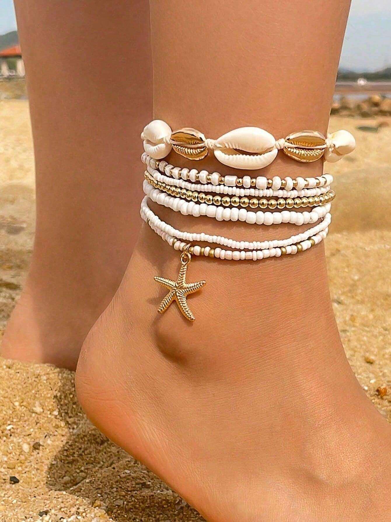 خلخال صيفي أنيق مستوحى من أجواء البحر، يجمع بين الخرز الأبيض والذهبي مع أصداف طبيعية تمنحك لمسة من الجمال البوهيمي المميز. يتميز بتصميم متعدد الطبقات يتدلى منه شكل نجمة البحر الذهبية ليضفي لمسة أنثوية جذابة ومليئة بالحيوية. مثالي للرحلات الشاطئية والإطلالات الصيفية المريحة، ويكمل أناقتك مع الفساتين أو الملابس الكاجوال بخفة وأناقة.