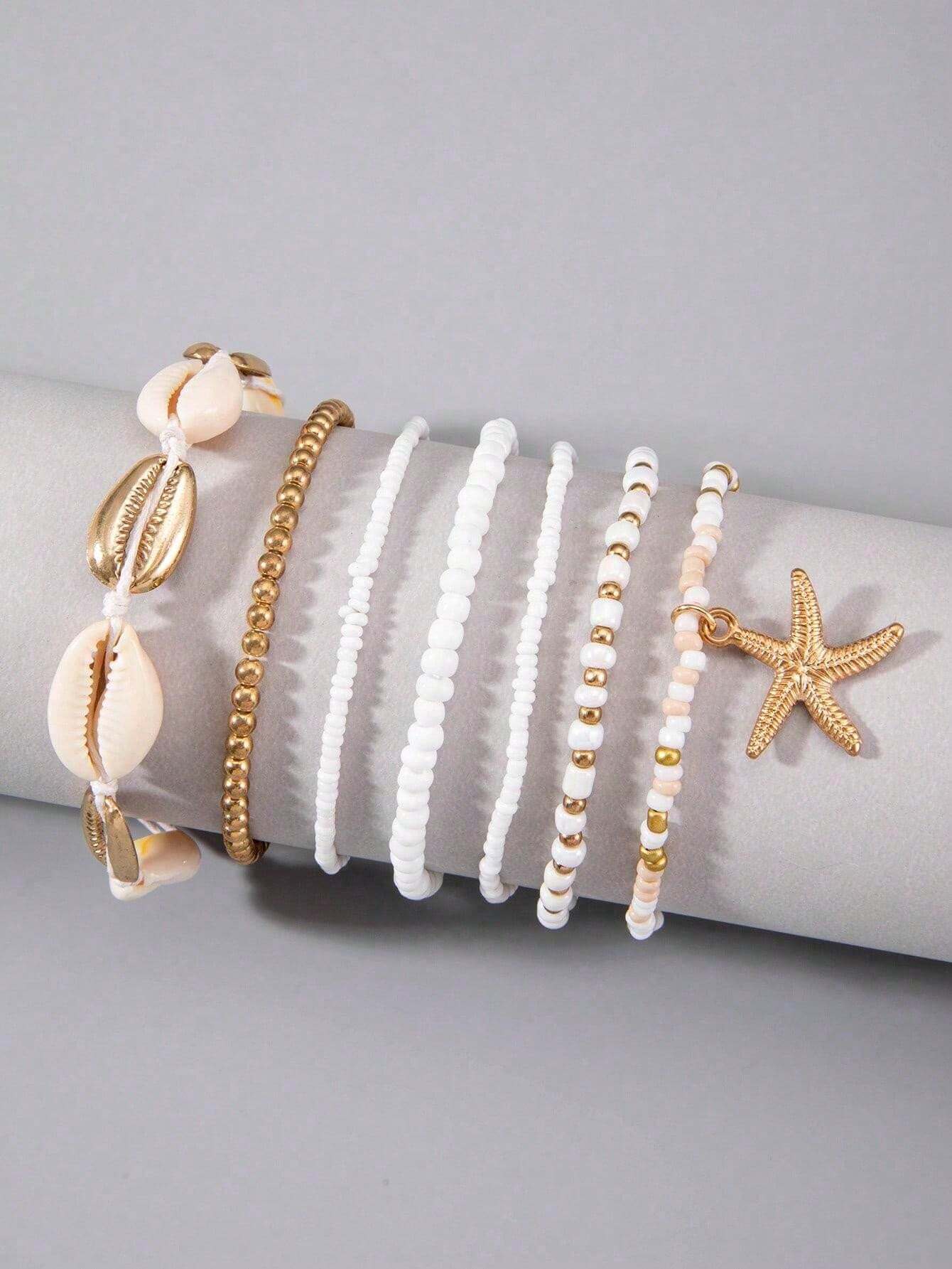 مجموعة مجوهرات إيمولي مصنوعة من خرز الأرز المعدني البسيط، ونجمة البحر، وسلسلة زينة من الكريستال، وقلادة شرابة، وسوار كاحل، وحبل منسوج