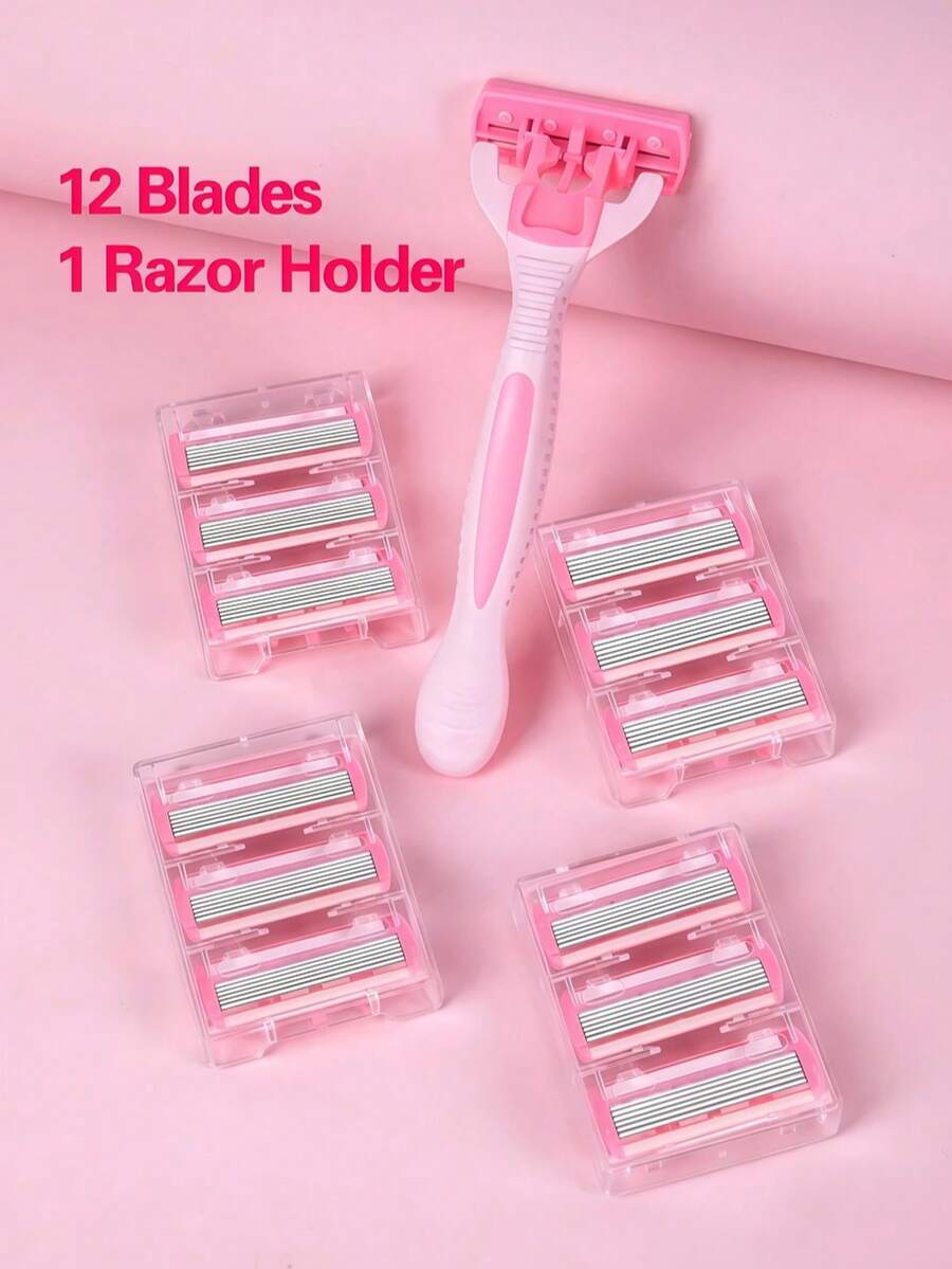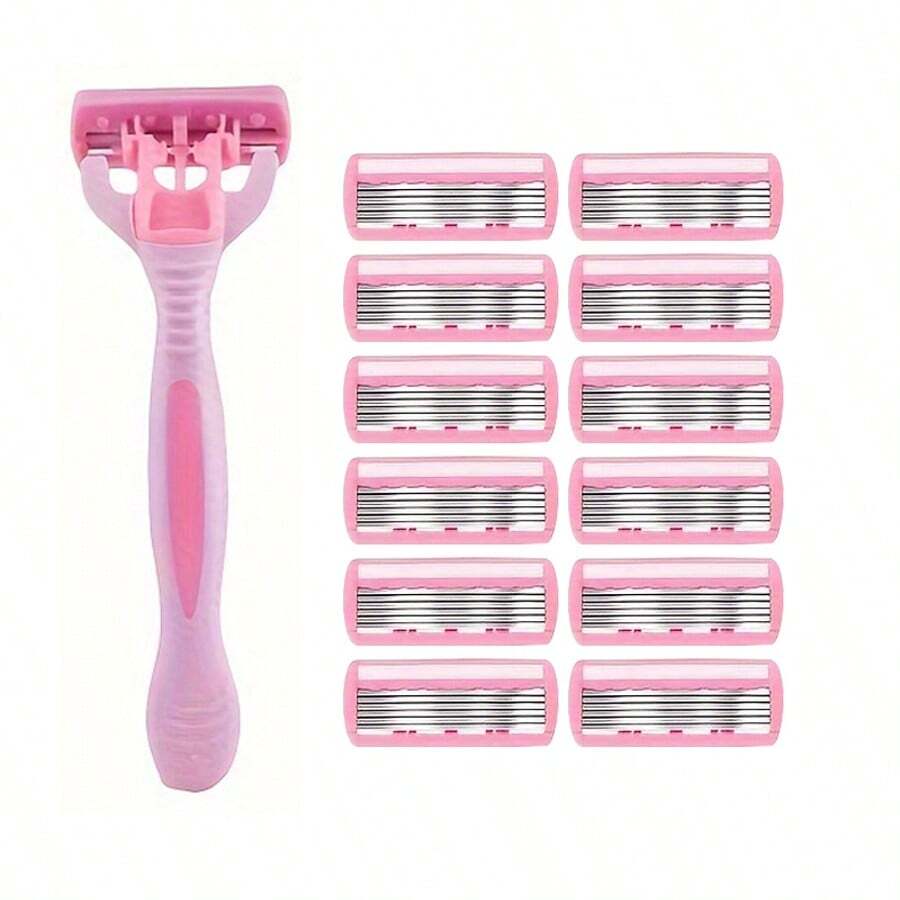 مقبض واحد + 6شفرة / ماكينة حلاقة يدوية لإزالة شعر الجسم والبكيني للنساء بشفرة من الفولاذ المقاوم للصدأ مكونة من 6 طبقات قابلة للاستبدال وشفرات حلاقة نظيفة باللون الوردي