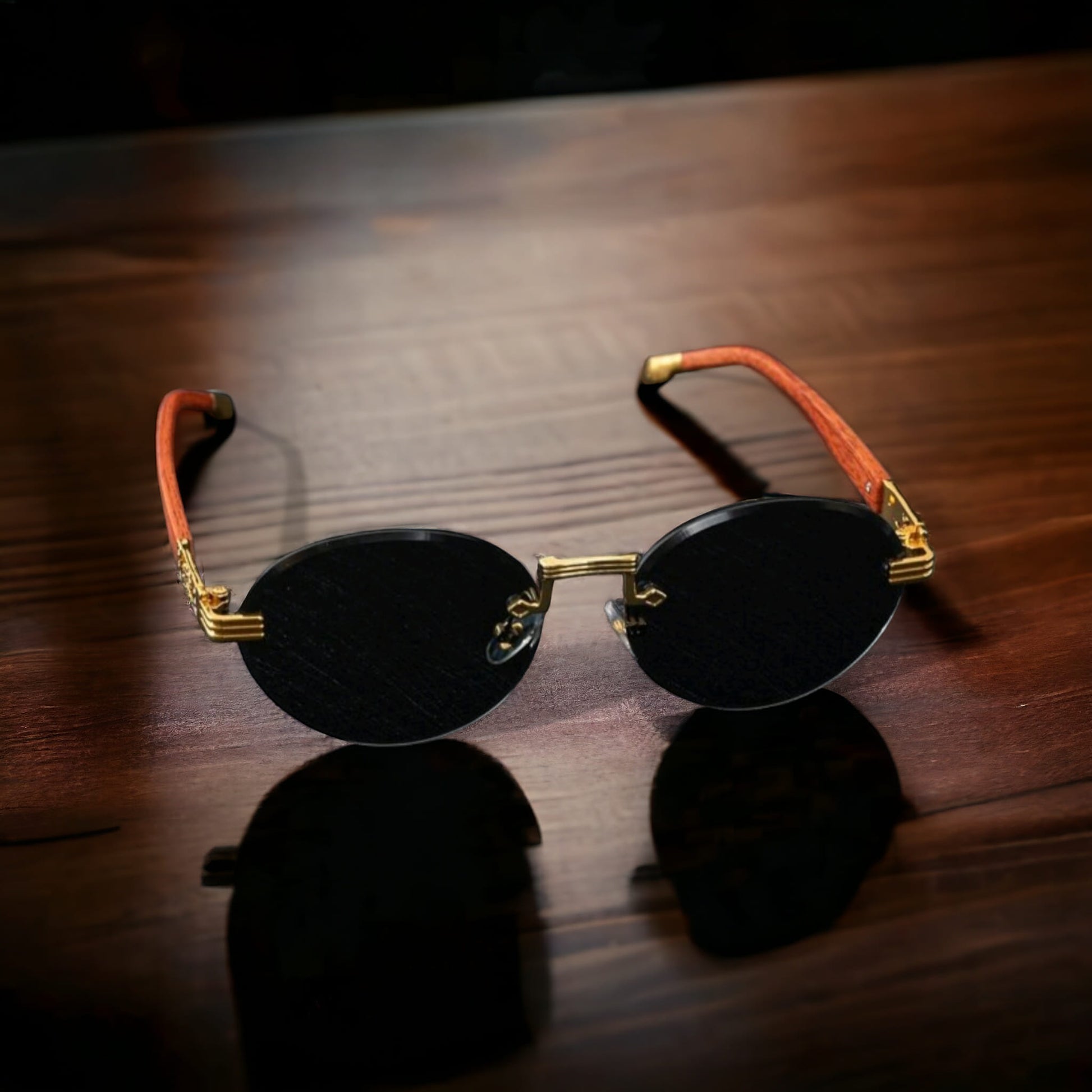نظارة شمسية بإطار معدني ذهبي وأذرع خشبية كلاسيكية
