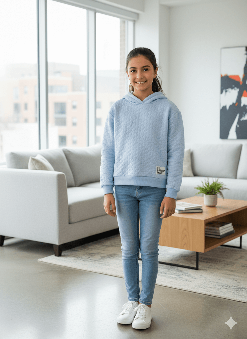 هودي مخصص للأطفال بتصميم بسيط ولون أزرق فاتح هادئ. يتميز بخامة مبطنة ناعمة مع نقشة بارزة خفيفة تضيف لمسة جمالية للتصميم. يأتي بغطاء رأس عملي وأكمام طويلة منتهية بأساور مطاطية لمزيد من الراحة أثناء الارتداء. مناسب للاستخدام اليومي في الأجواء المعتدلة والباردة.