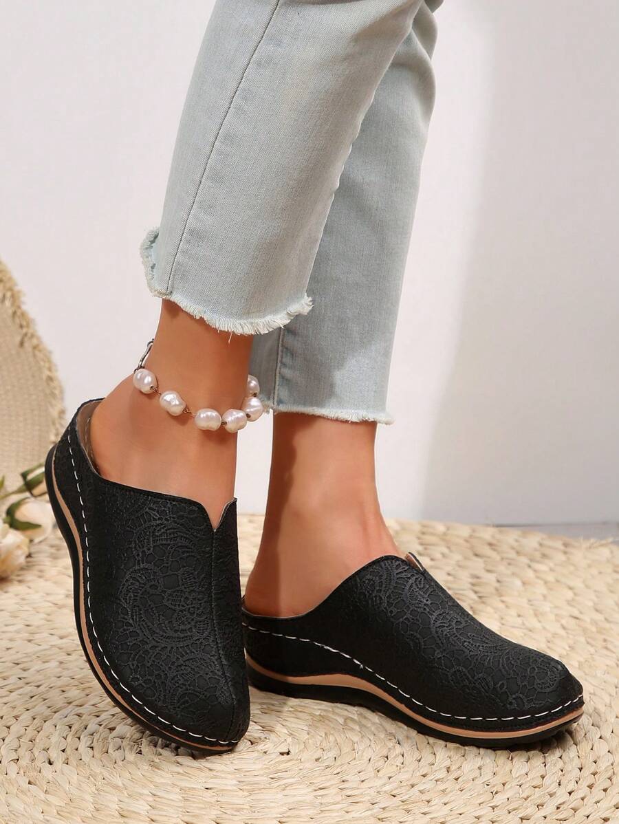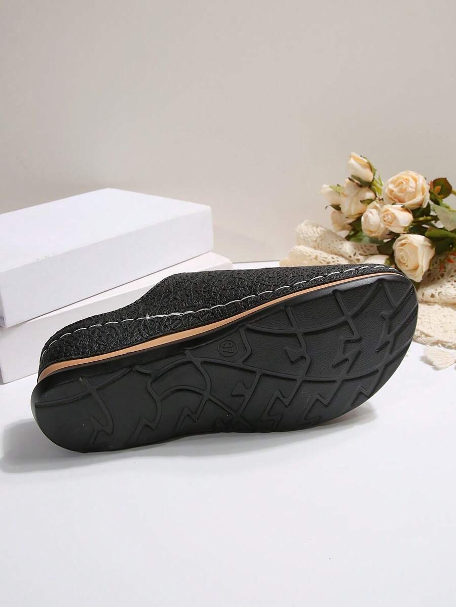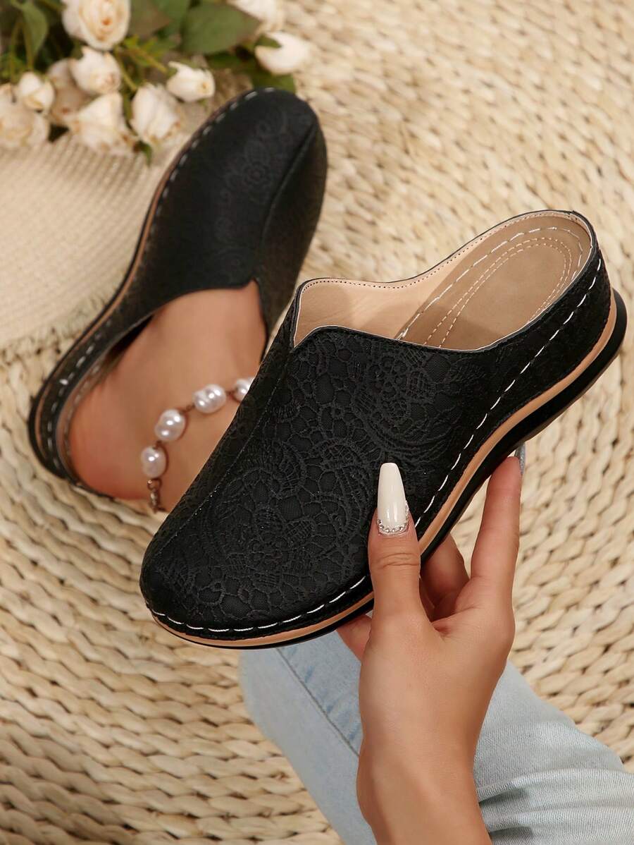 شبشب بتصميم بسيط ولون أسود، مصنوع من خامة ناعمة عليها نقشة دانتيل خفيفة. شكله أنيق وعملي، والنعل جاي بشكل مريح يساعد على سهولة الحركة. مناسب للاستخدام اليومي أو للبيت بشكل هادي ومريح.