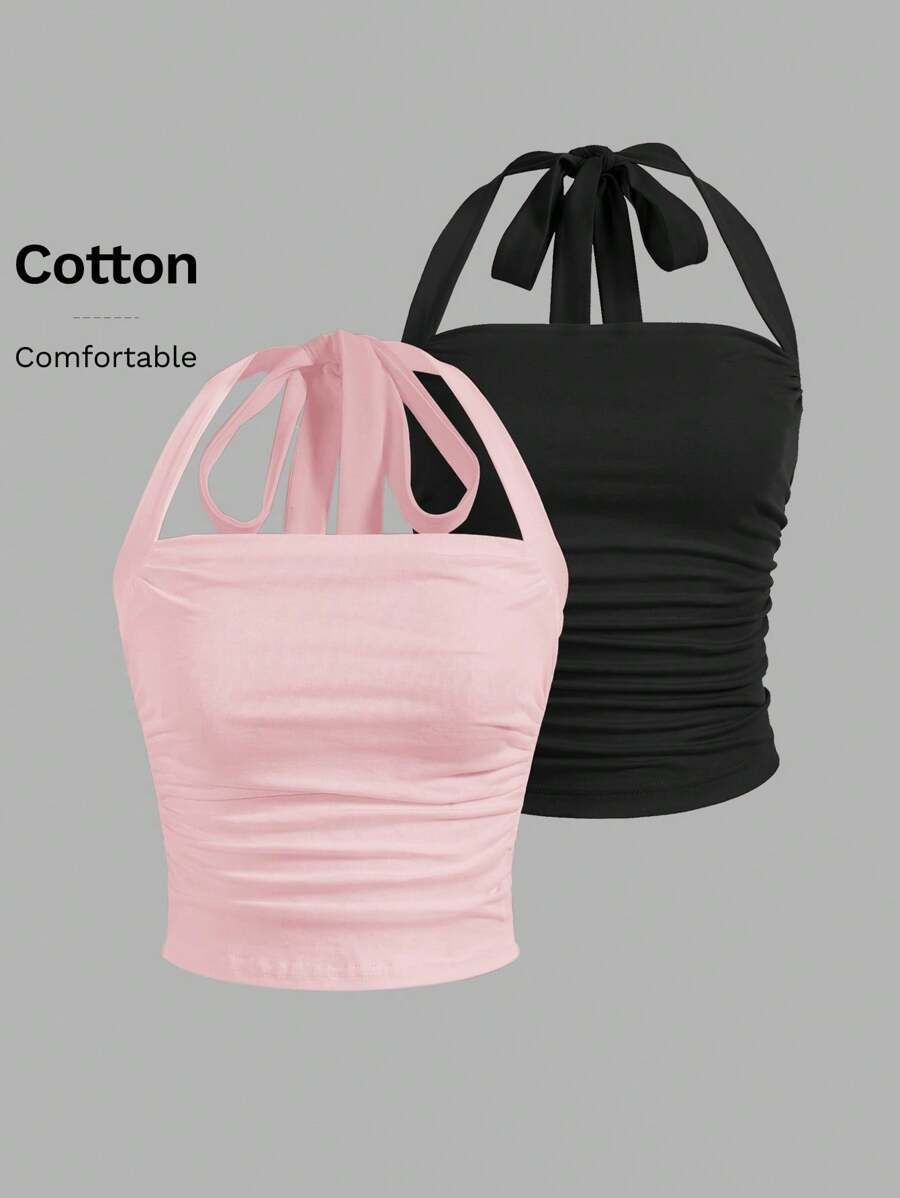 طقم SHEIN EZwear المكوّن من توب هالتر مجمّع ضيّق وتنورة/شورت متناسق بلون سادة أنيق. تصميمه العصري يمنحك إطلالة أنثوية ملفتة ومثالية لأيام الصيف، الشاطئ أو الخروجات الكاجوال. 🌞