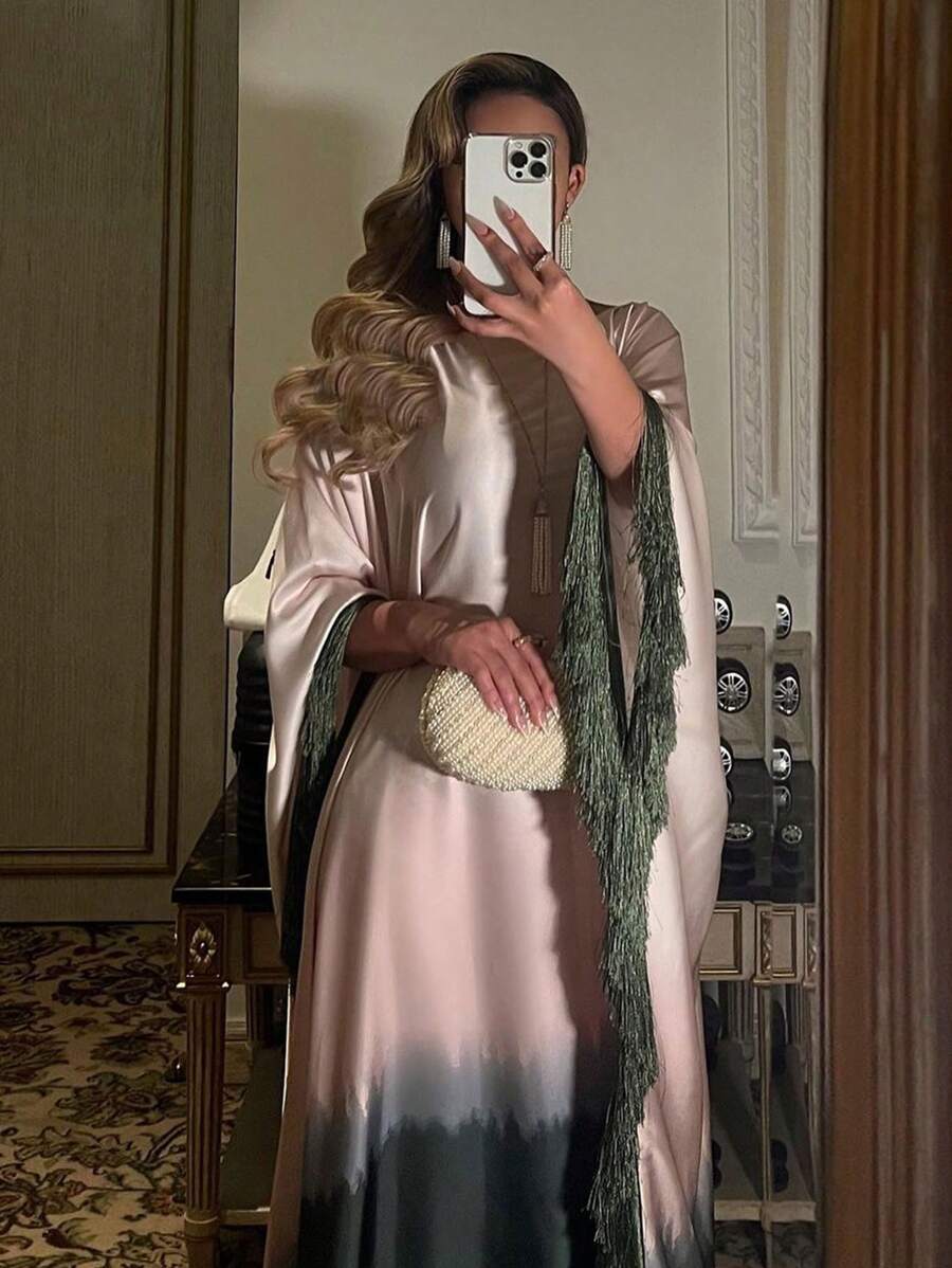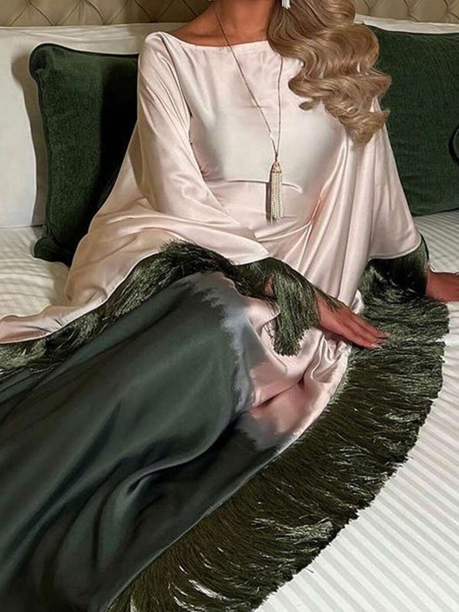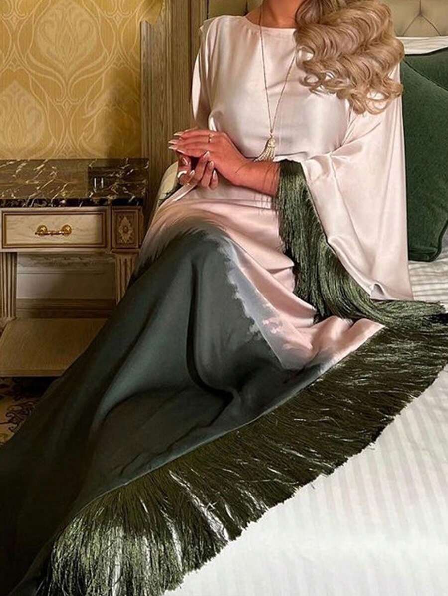 فستان طويل مصنوع من قماش ساتان لامع بدرجات الوردي الفاتح مع طرف سفلي بلون غامق. يتميز بأكمام واسعة منسدلة مزينة بشراشيب خضراء على الأطراف. التصميم بسيط بانسيابية خفيفة تعطي شكل متوازن وناعم، مع ياقة دائرية مغلقة وطول يغطي الأرض تقريبًا.