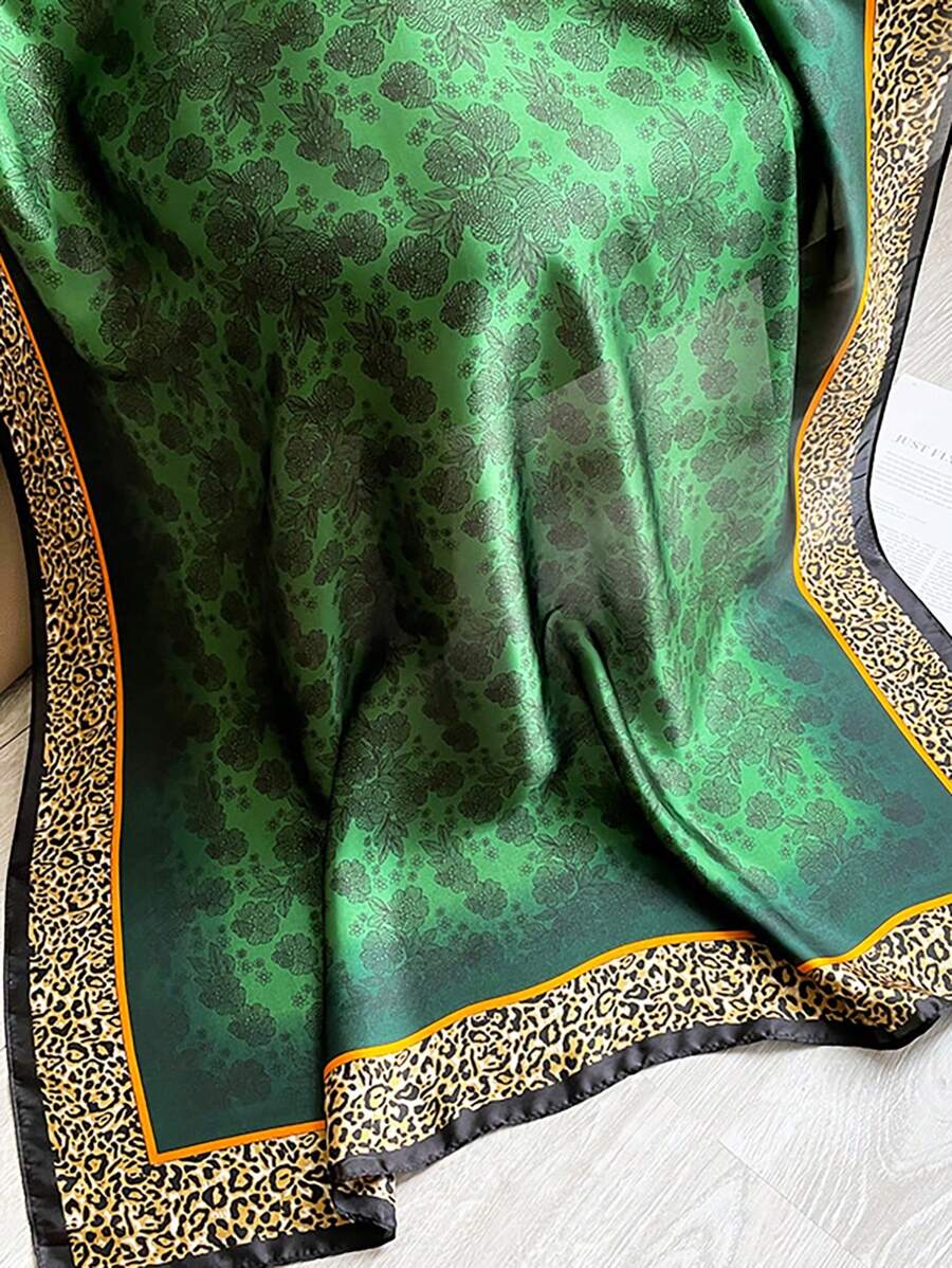 إيشارب أنيق بخامة حريرية لامعة باللون الأخضر الغامق، مزين بنقوش زهرية خفيفة مع حواف بإطار بنقشة الفهد ولمسة برتقالية. خامته ناعمة على البشرة وسهل التنسيق مع الإطلالات الكلاسيكية أو العصرية.